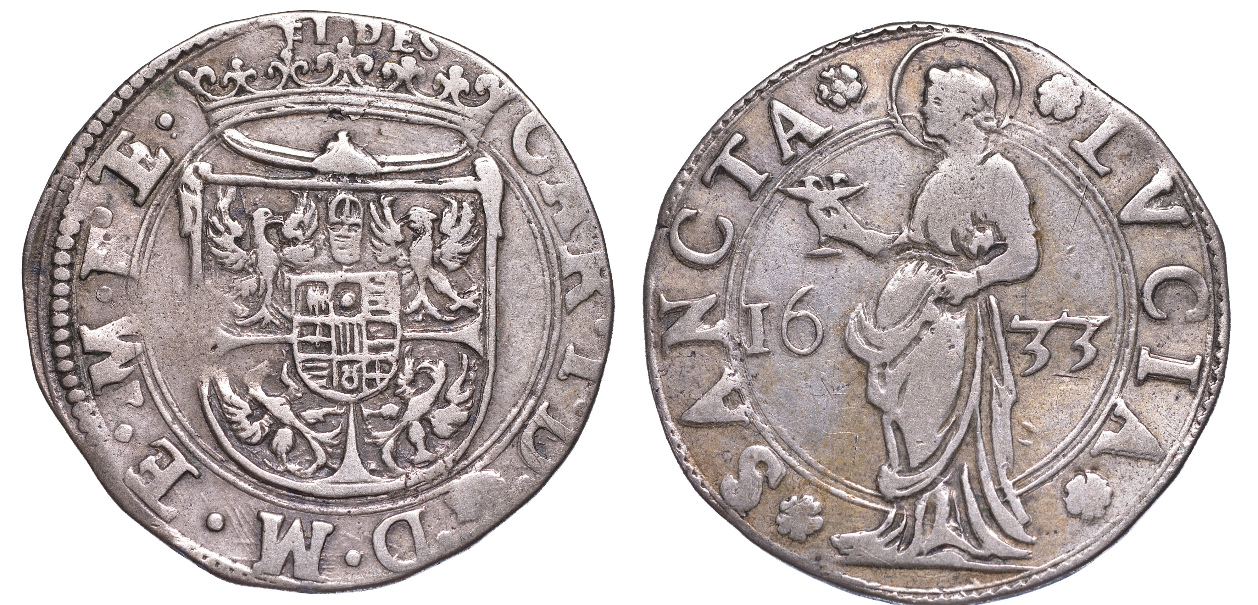 Stemma coronato. R/ Santa Lucia con coppa; ai lati, 16 33. CNI 19/21. MIR 650. g. 4,82. Diam. mm. 27,05. Arg. Irregolarità di conio. q.BB