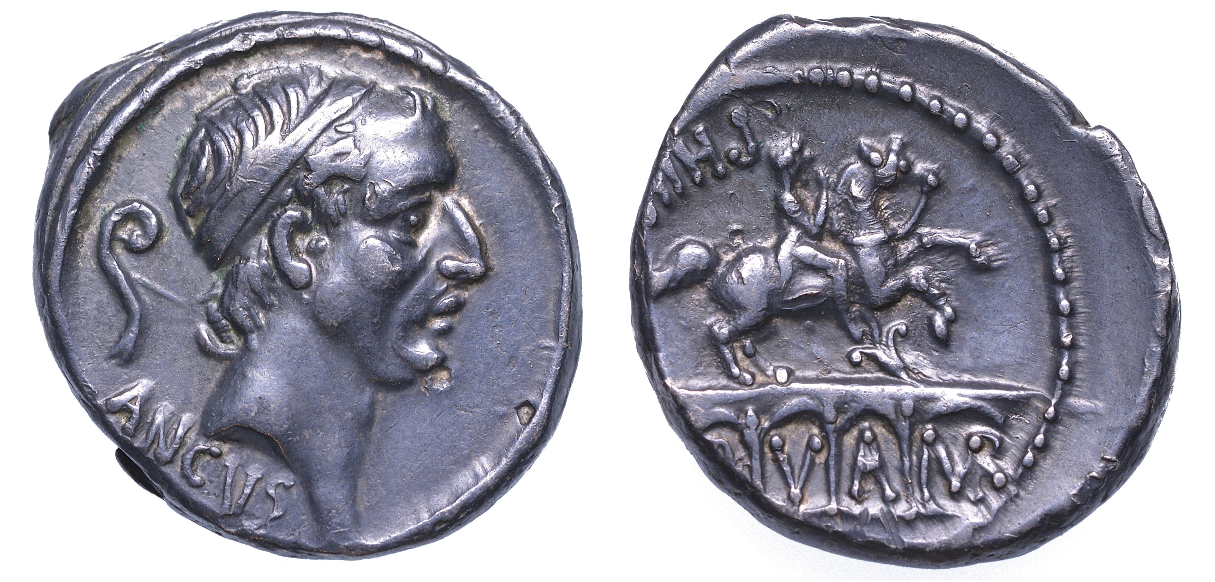 Testa di Anco Marzio a d.; dietro, lituo. R/ Statua equestre verso d. sopra gli archi di un acquedotto; sotto il cavallo, fiore. Bab. (Marcia) 28. Cr. 425/1. Syd. 919. g. 3,98. Diam. mm. 16,52. Arg. Buon BB
