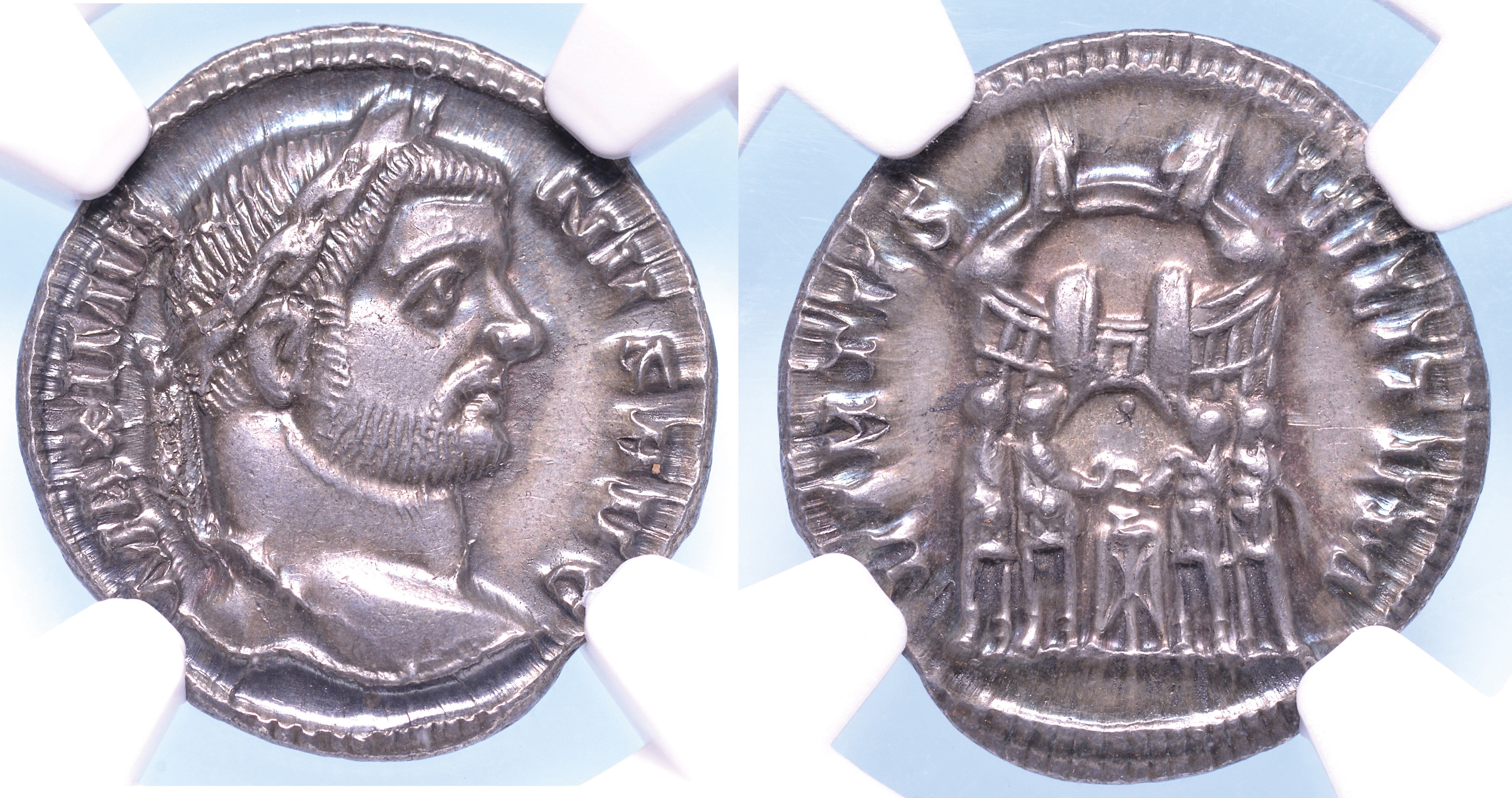 Testa laureata a d. R/ Mura fortificate turrite con i quattro tetrarchi che giurano sul treppiede. Coh. 622. Diam. mm. 18,20. Arg. SPL