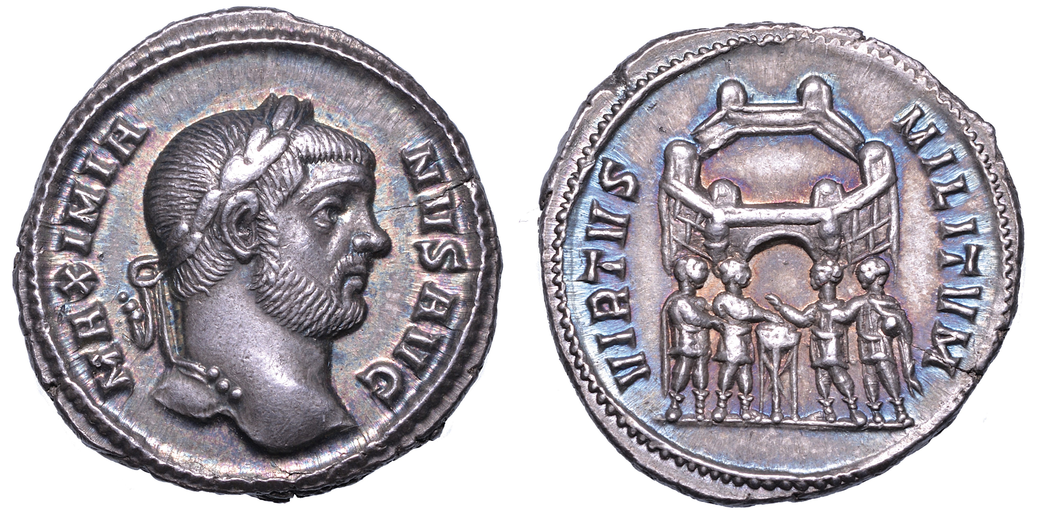 Testa laureata d. R/ Mura fortificate turrite con i quattro tetrarchi che giurano sul treppiede. Coh. 622. Sisak 12a. RIC 32b. g. 3,09. Diam. mm. 17,87. Arg. Bellissima patina iridescente. Impercettibile e consueta frattura di conio. Esemplare estremamente gradevole. SPL