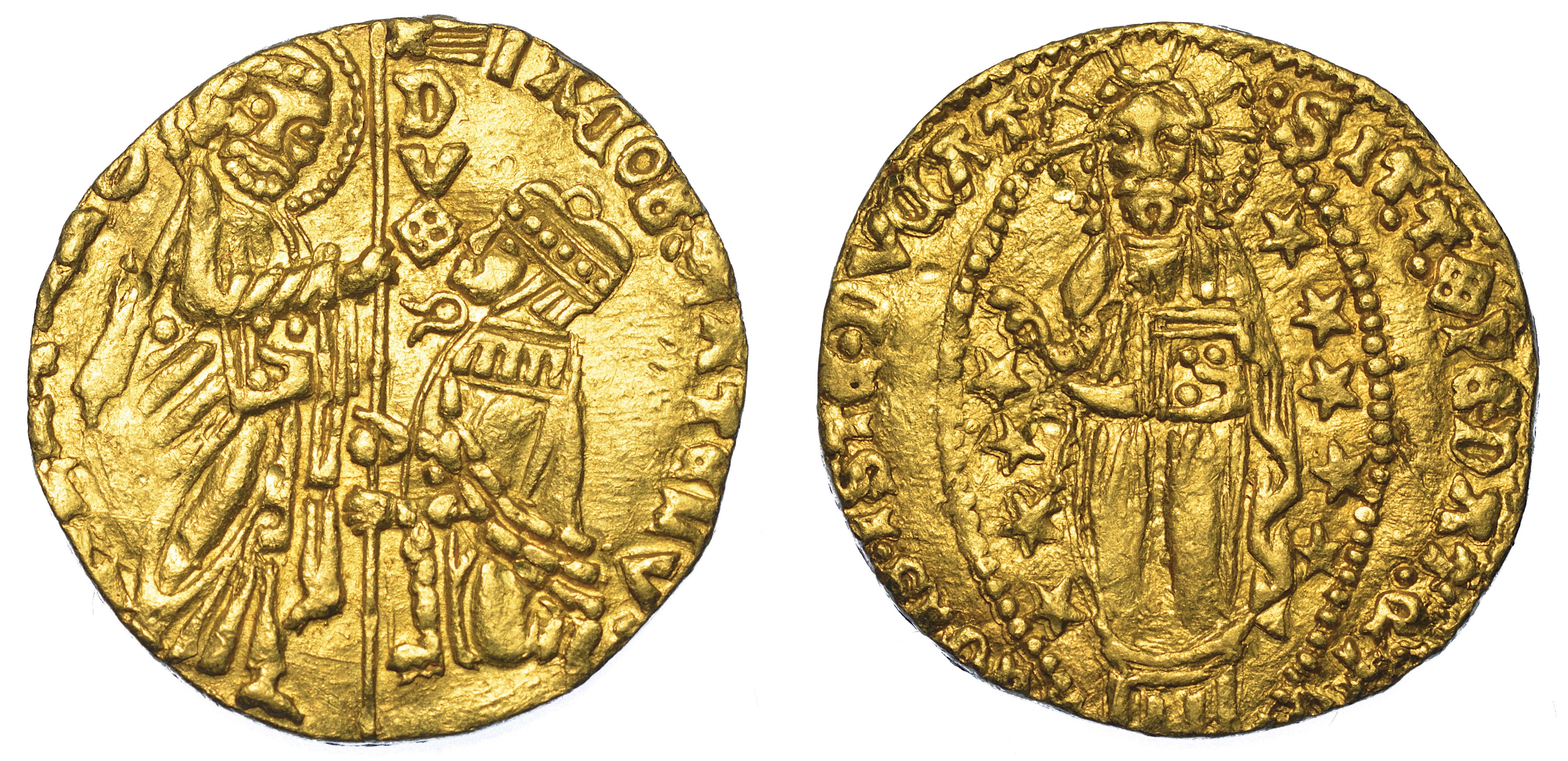 Il Santo in piedi porge il vessillo al doge genuflesso. R/ Il Redentore in piedi in aureola ellittica. Gamb. 366. Lunardi G3. Schlumberger tav. XVI, n. 7. g. 3,53. Diam. mm. 20,53. Oro. q.SPL