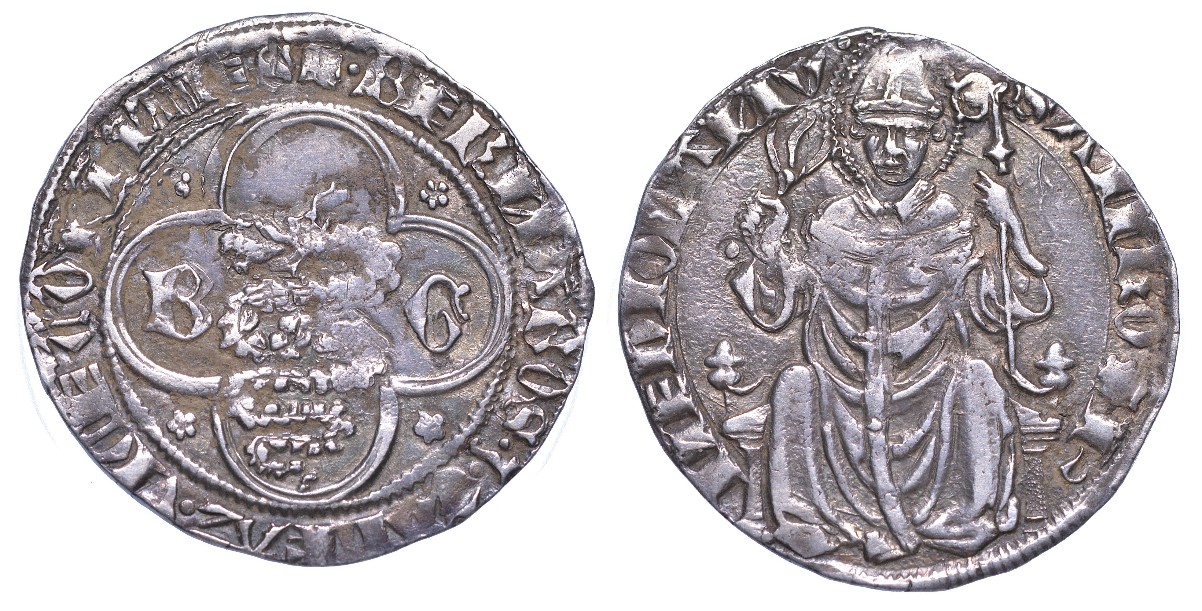 Biscia entro cornice, tra le iniziali B – G; agli angoli della cornice, rosette a cinque petali. R/ Sant’Ambrogio imberbe, mitrato e nimbato, in cattedra, seduto di prospetto, con staffile nella mano d. e pastorale nella s. Crippa 2/A. g. 2,56. Diam. mm. 23,84. Arg. BB