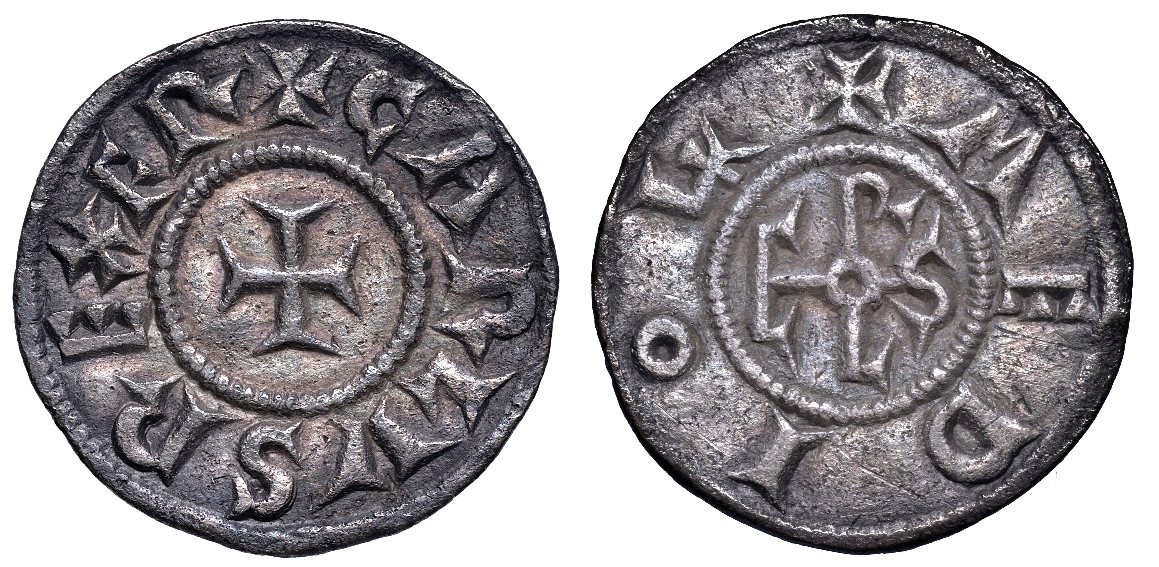 Croce patente. R/ Monogramma di Carlo Magno. Crippa 4. Molto raro. g. 1,65. Diam. mm. 20,23. Arg. q.BB