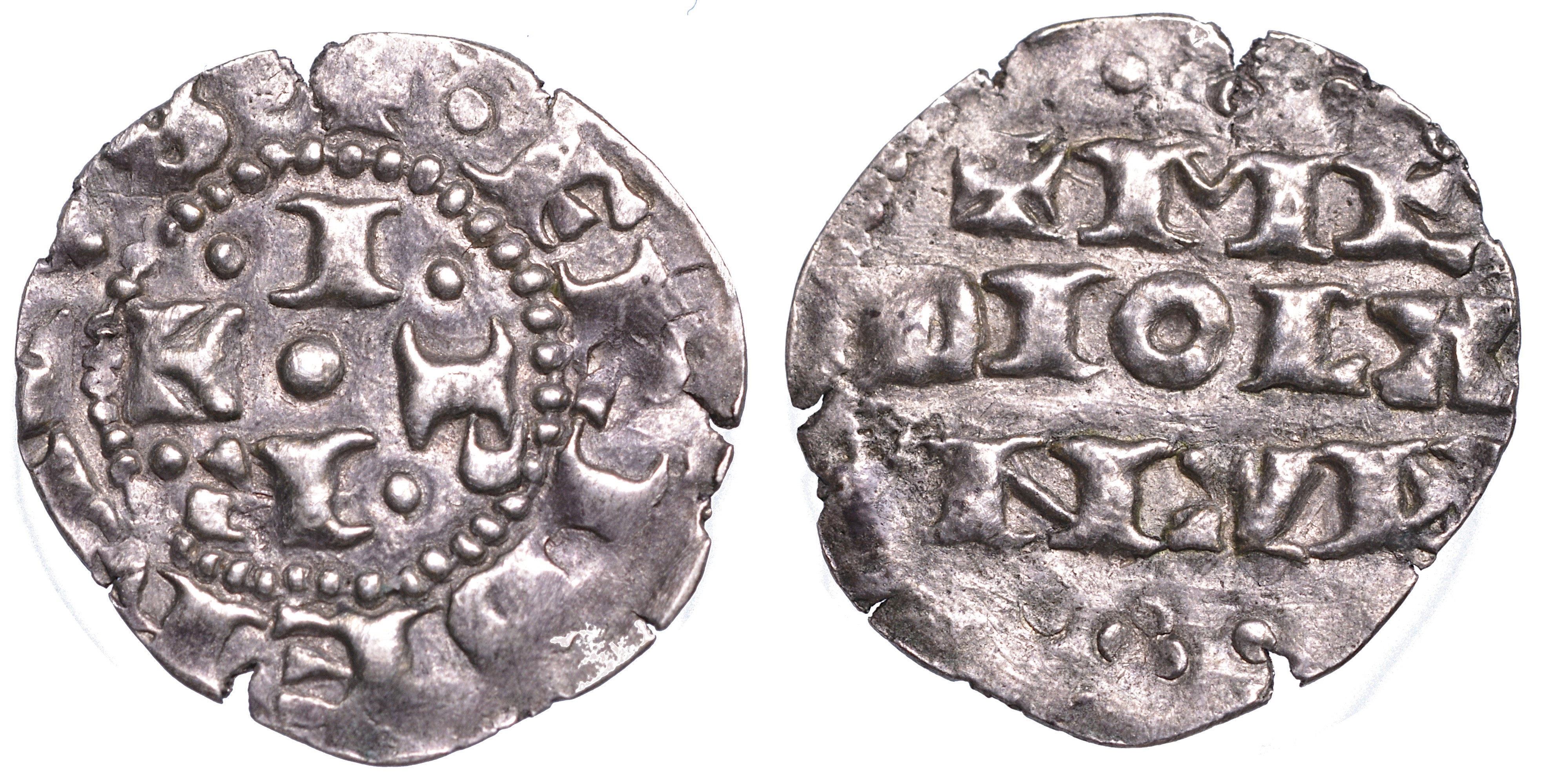 Lettere I P R T intervallate da globetti; al centro, globetto. R/ + ME DIOLA NVM in tre righe; sopra e sotto, rosetta con stelo tra due trifogli. Crippa 17/A. CNI, Federico II, tipo 1/7-13/15. Murari 1981, Federico II, 27. g.0,82. Diam. mm. 17,54. Mist. BB