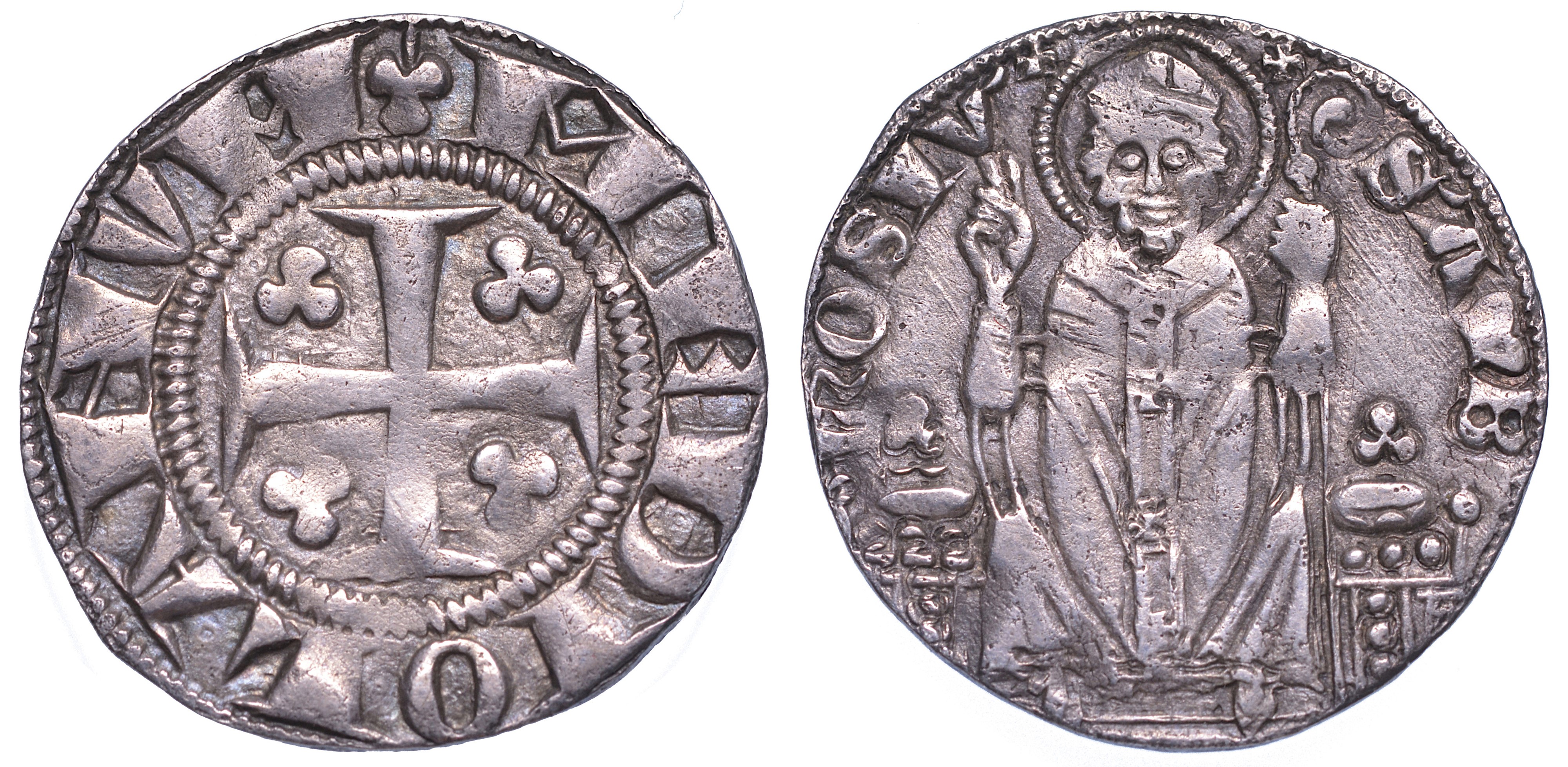 Croce accantonata da quattro trifogli. R/ Sant'Ambrogio, mitrato e nimbato, seduto in cattedra di prospetto, stringe nella s. il pastorale e alza la mano d. in atto di benedire. Crippa 27/C var. (crocetta sul lato della testa di S'Ambrogio ma trifoglio con stelo). CNI (Prima Repubblica) 25. Rarissimo. g. 1,71. Diam. mm. 19,31. Arg. q.BB
