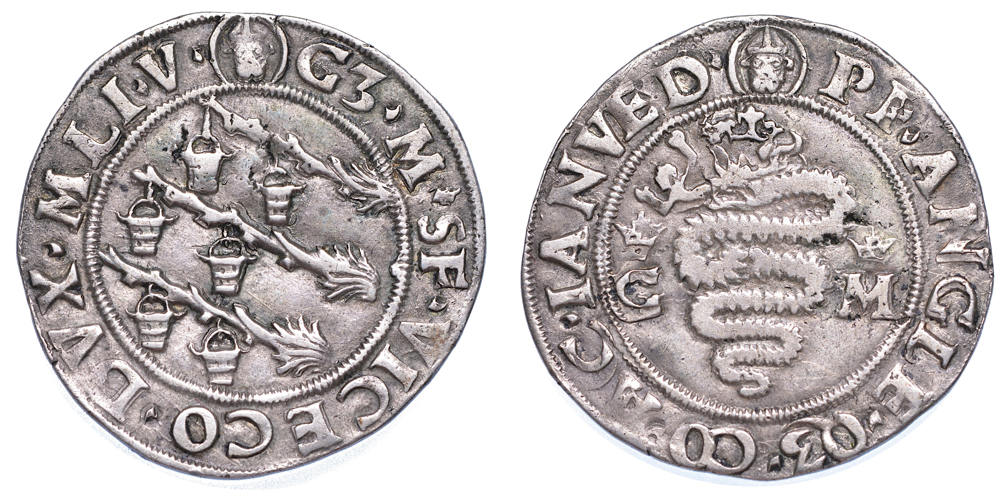 L’impresa dei tizzoni ardenti con le secchie. R/ Biscia coronata tra le lettere G – M sormontate da corone. Crippa 10. g. 3,01. Diam. mm. 23,78. Arg. q.BB