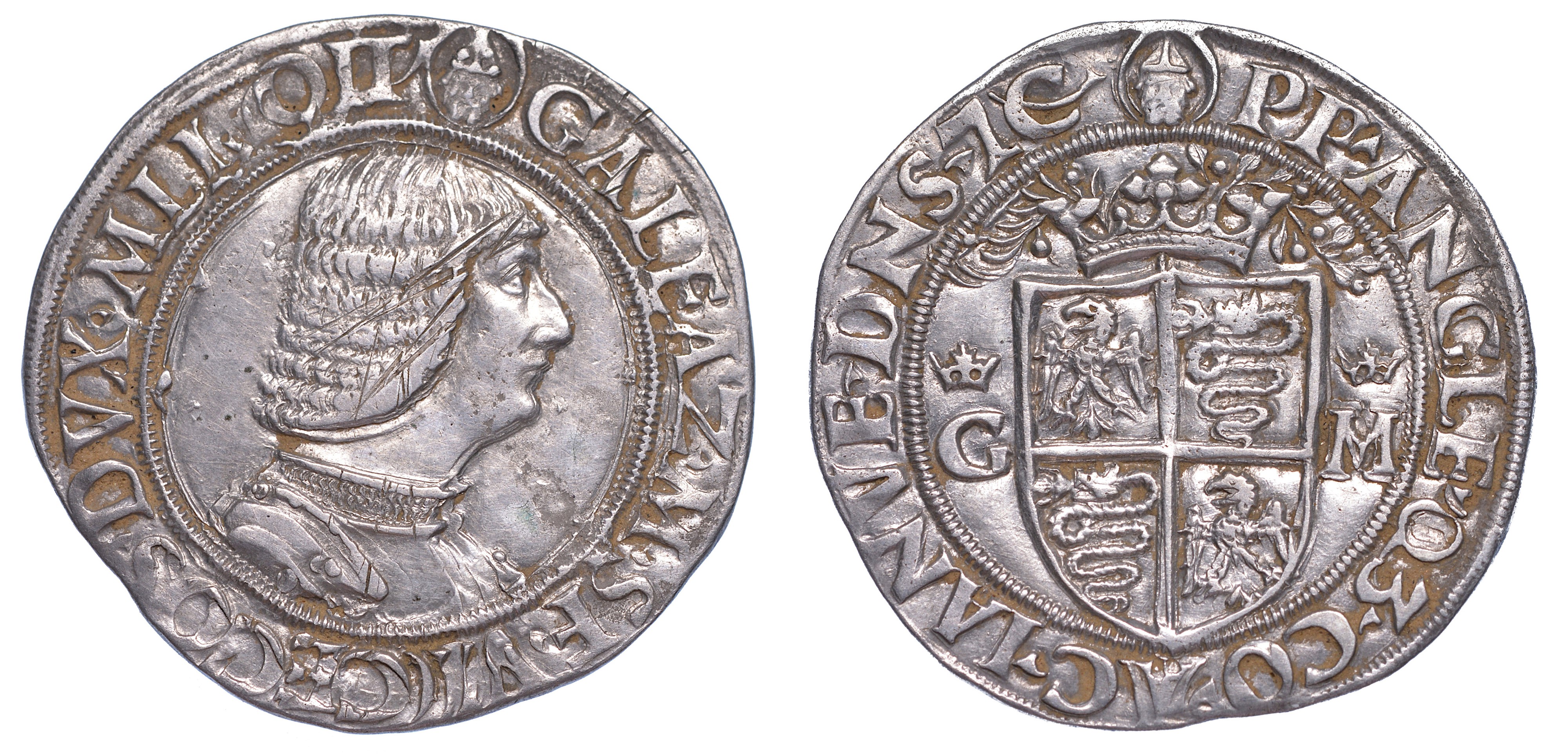 Busto a d. corazzato e a testa nuda. R/ Scudo inquartato con l’aquila imperiale e la biscia; sopra, corona ducale con rami di palma e di olivo. Ai lati, le iniziali G – M, sormontate da corona. Crippa 8. Raro. g. 5,08. Diam. mm. 27,69. Arg. Graffi. SPL