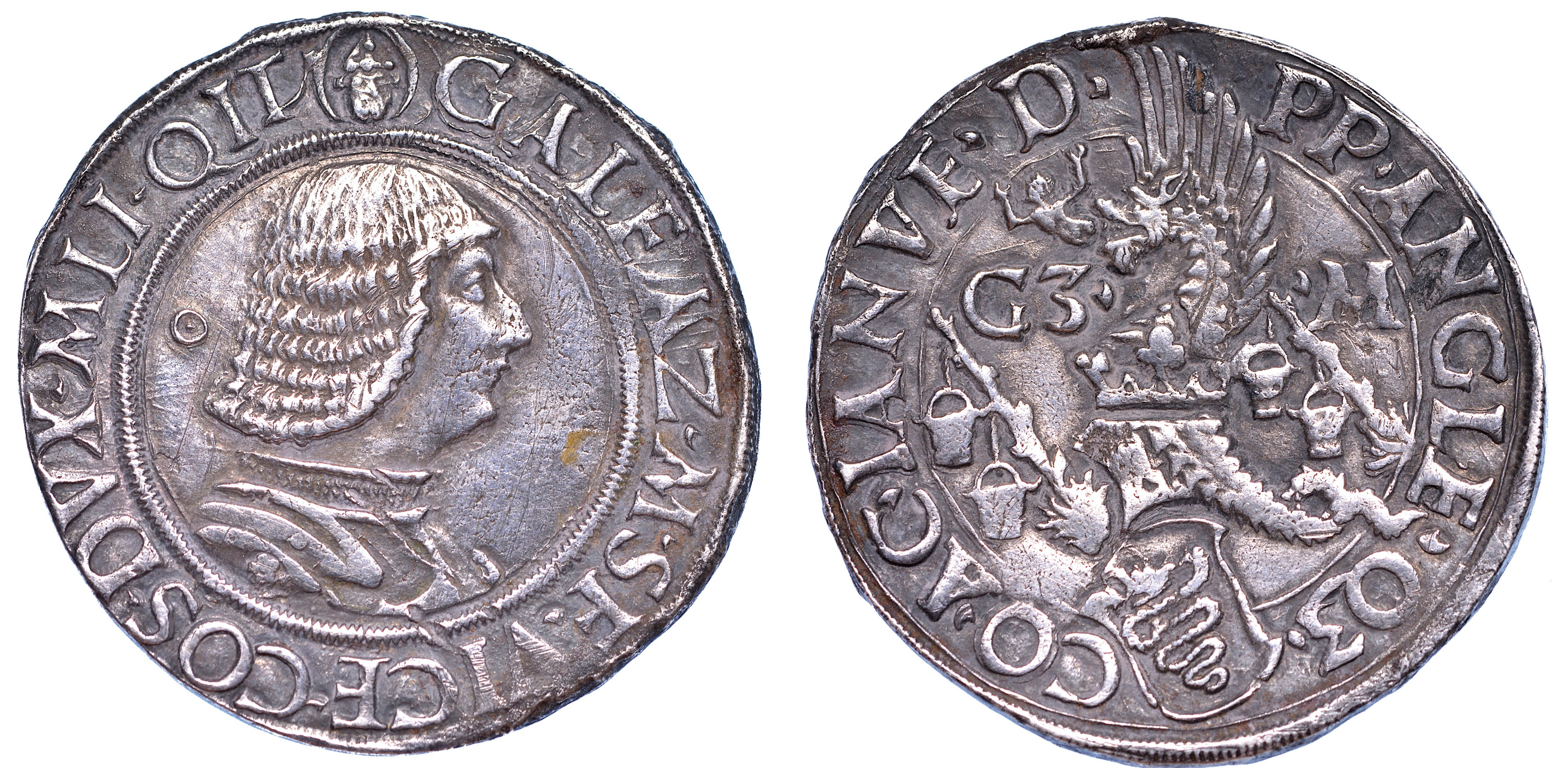 Busto a d., corazzato e a testa nuda, di Galeazzo Maria Sforza; dietro la testa, borchia. R/ Scudetto con la biscia non coronata, sormontato da elmo coronato e cimiero ornato da drago crestato. Ai lati, i tizzoni con le secchie e le lettere G3 – M. Crippa 6/A. g. 9,47. Diam. mm. 29,10. Arg. Lievi graffi da pulizia. Buon BB