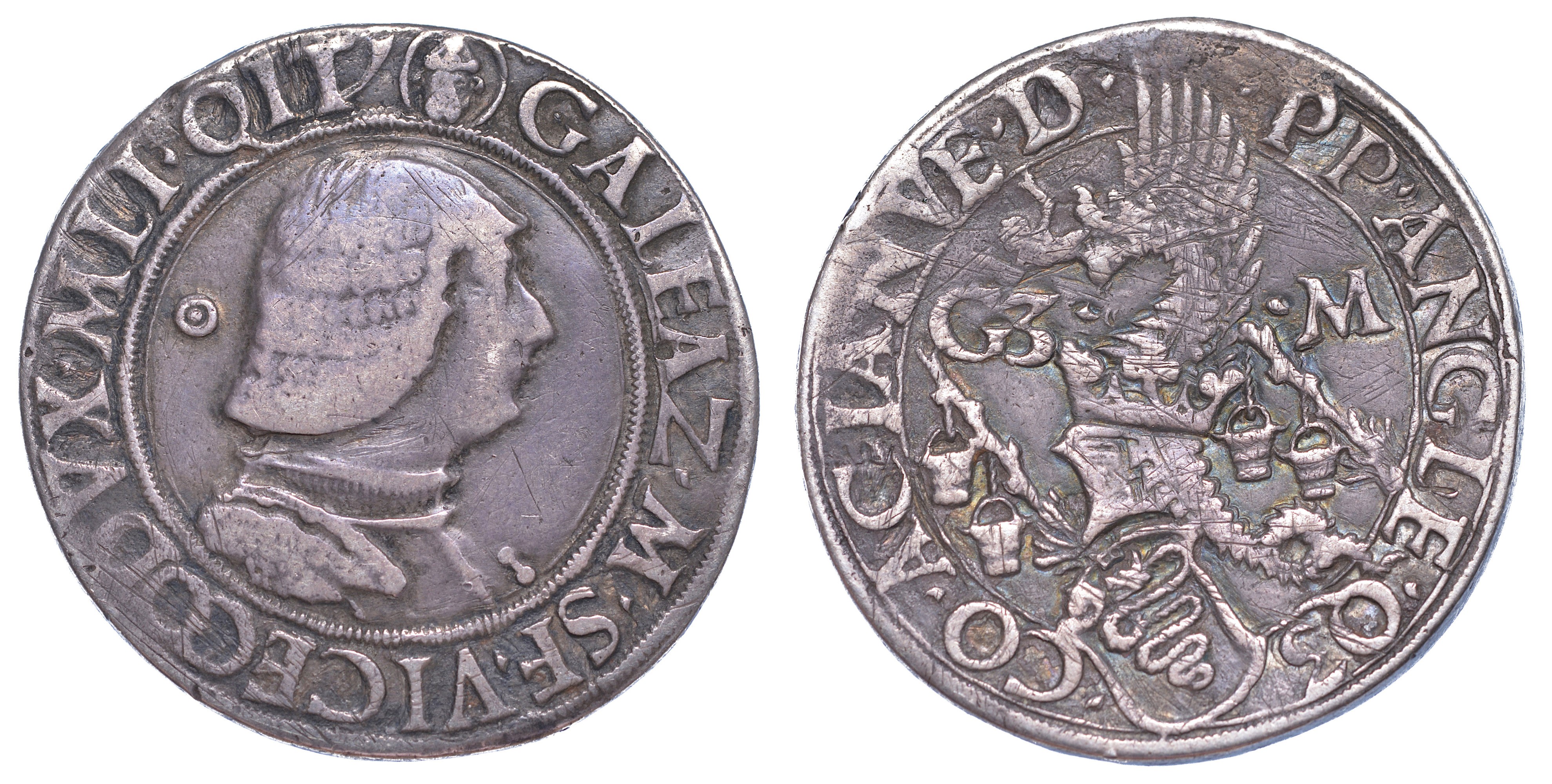 Busto a d., corazzato e a testa nuda, di Galeazzo Maria Sforza; dietro la testa, borchia. R/ Scudetto con la biscia coronata, sormontato da elmo coronato e cimiero ornato da drago crestato. Ai lati, i tizzoni con le secchie e le lettere G3 – M. Crippa 6/B (varietà molto rara con biscia coronata). Molto raro. g. 9,60. Diam. mm. 29,10. Arg. Lievi graffi. MB/q.BB