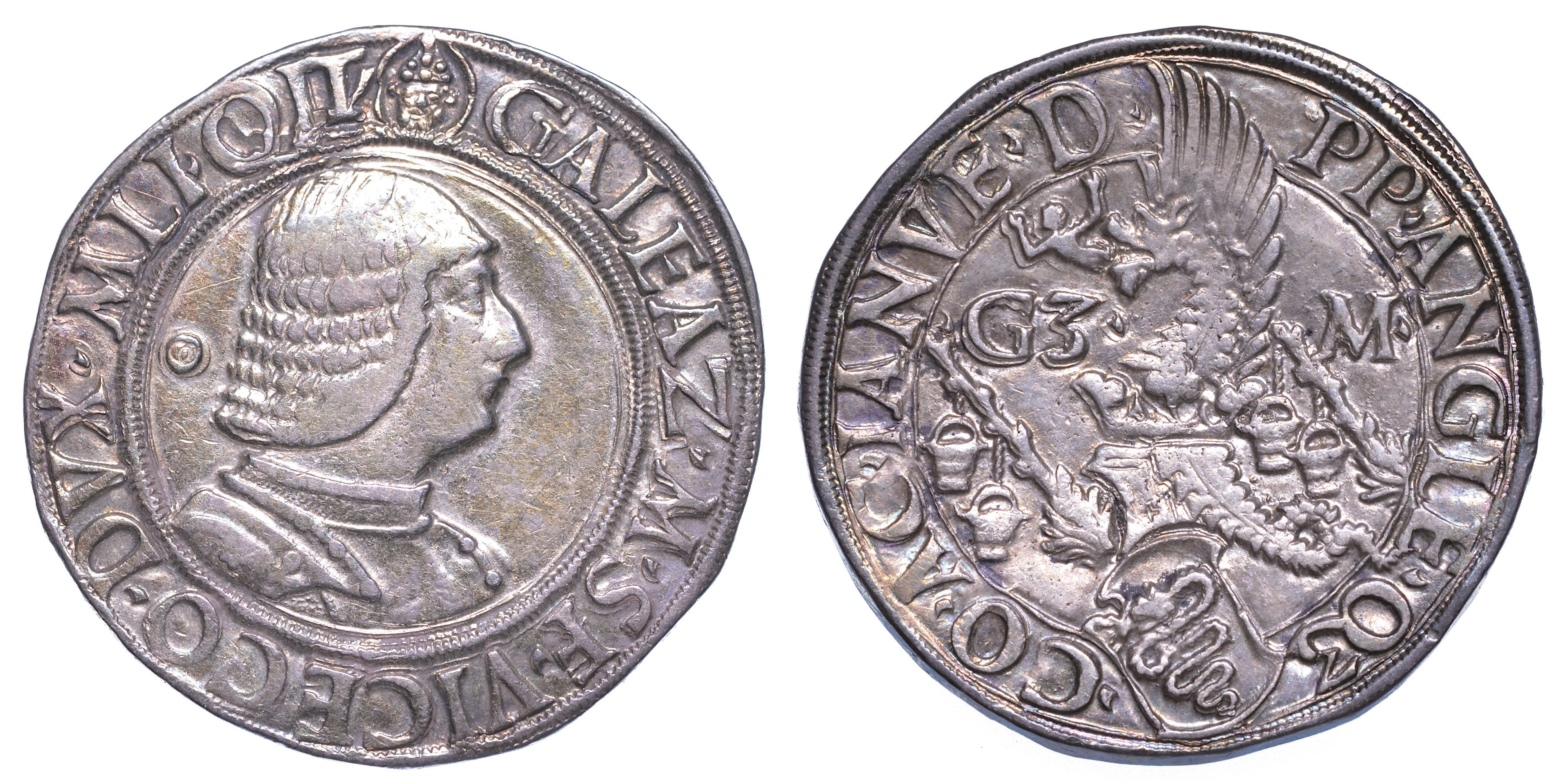 Busto a d., corazzato e a testa nuda; dietro la testa, borchia. R/ Scudetto con la biscia non coronata, sormontato da elmo coronato e cimiero ornato da drago crestato. Ai lati, i tizzoni con le secchie e le lettere G3 – M. Crippa 6/A. g. 9,60. Diam. mm. 28,93. Arg. Brillante e iridescente patina di monetiere. BB