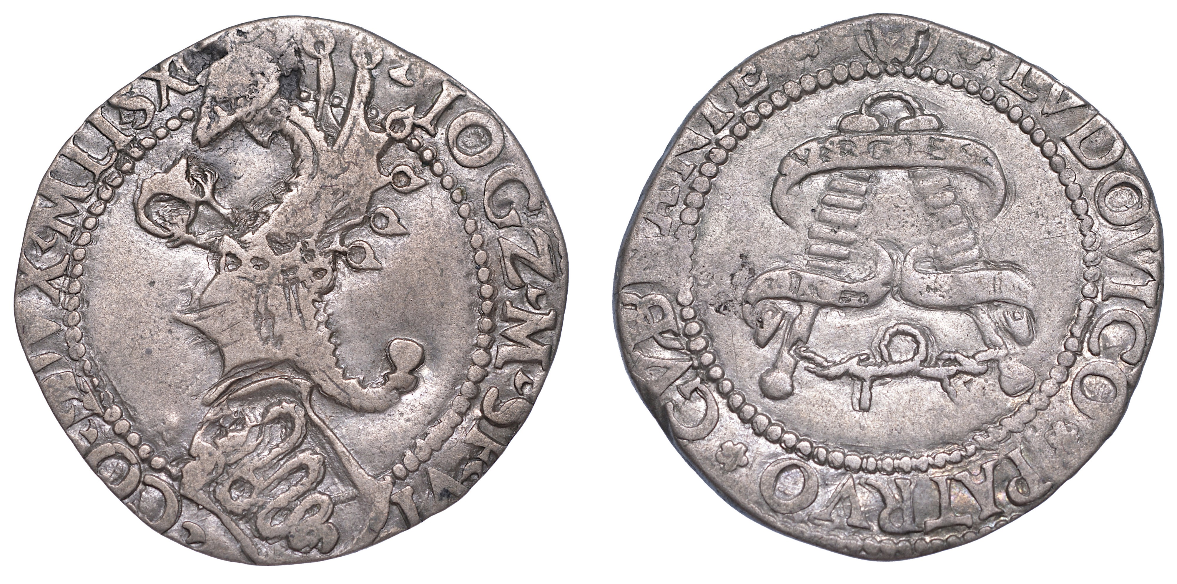 Elmo coronato con cimiero del drago. R/ Morso di cavallo con nastro. Crippa 7. MIR 225. g. 2,07. Diam. mm. 21,54. Arg. MB/BB