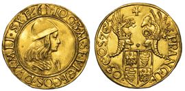 Busto corazzato con berretto a d. R/ Stemma inquartato di aquila e biscia, sormontato da due cimieri coronati: quello di s. ornato dal drago crestato e quello di s. da un mostro alato a testa di vecchio che stringe negli artigli un anello. Crippa 1. Bernareggi 96. Ravegnani Morosini 2. MIR 215/1. Molto raro. g. 6,93. Diam. mm. 26,84. Oro. Lievi abrasioni e ondulazioni. BB/q.SPL