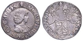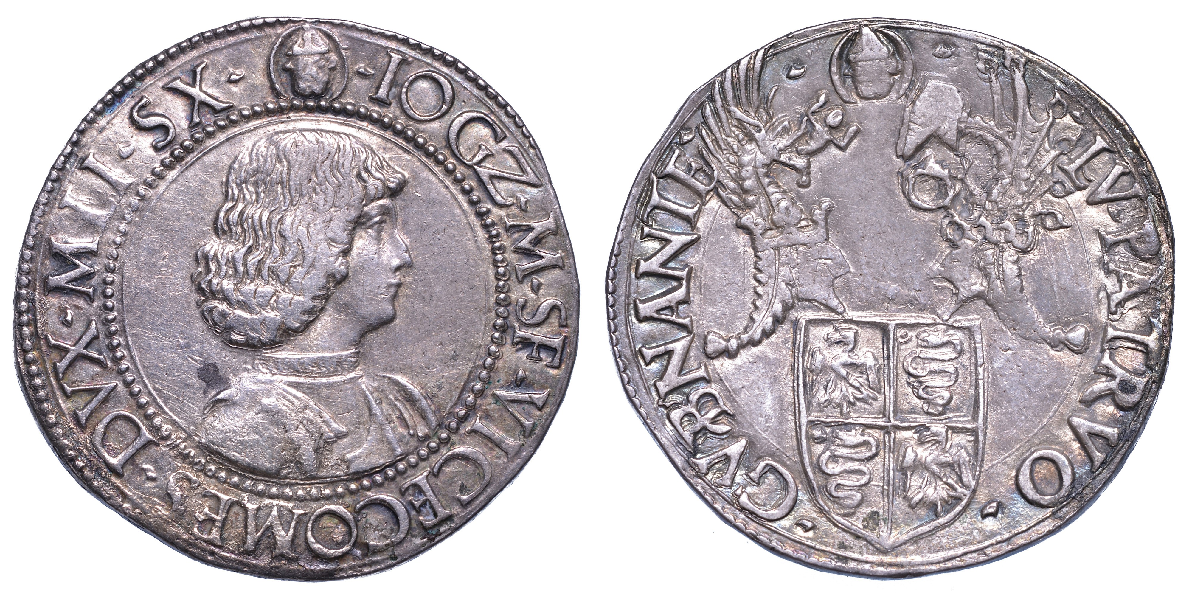 Busto a d. corazzato. R/ Stemma inquartato con aquila imperiale e biscia, sormontato da due elmi con cimiero: l'elmo di s. è coronato ed il cimiero è ornato da drago piumato; l'elmo di d. ha il cimiero che termina con mostro alato, con testa di vecchio, che stringe un anello. Crippa 4. CNI 32/36. RMM 9. MIR 222. Molto raro. g. 9,63. Diam. mm. 26,84. Arg. Lieve e gradevole iridescenza al rovescio. q.SPL