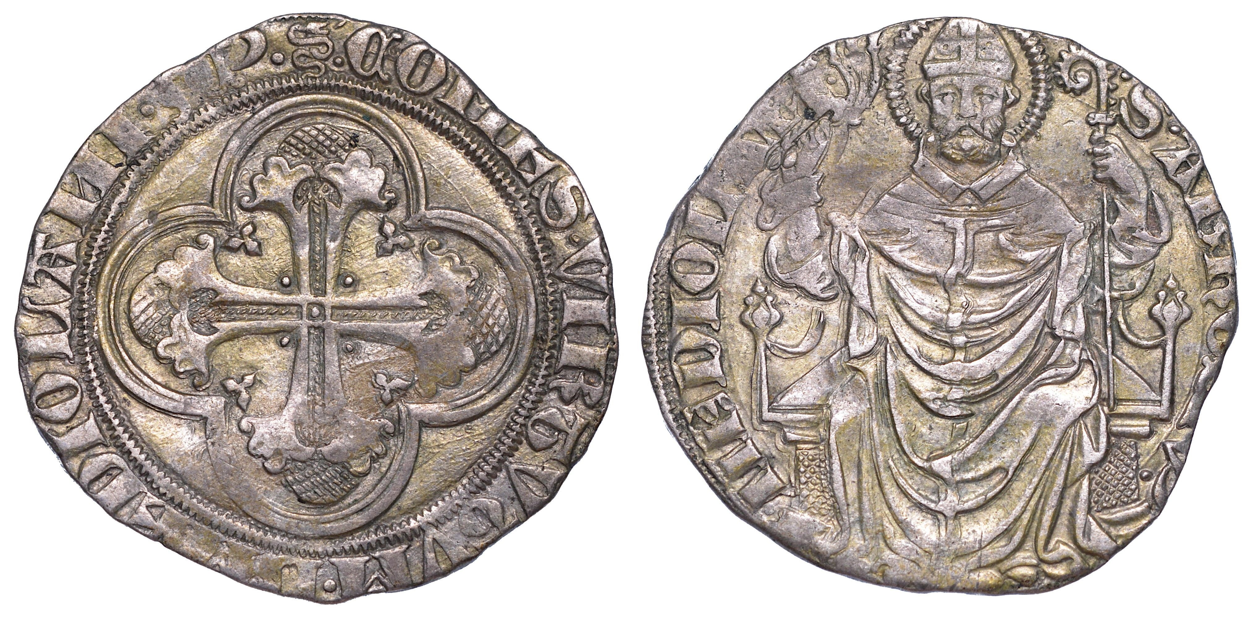 Croce gigliata in cornice. R/ Sant'Ambrogio seduto con staffile e pastorale. Crippa 7. MIR 119. g. 2,26. Diam. mm. 22,87. Arg. q.BB