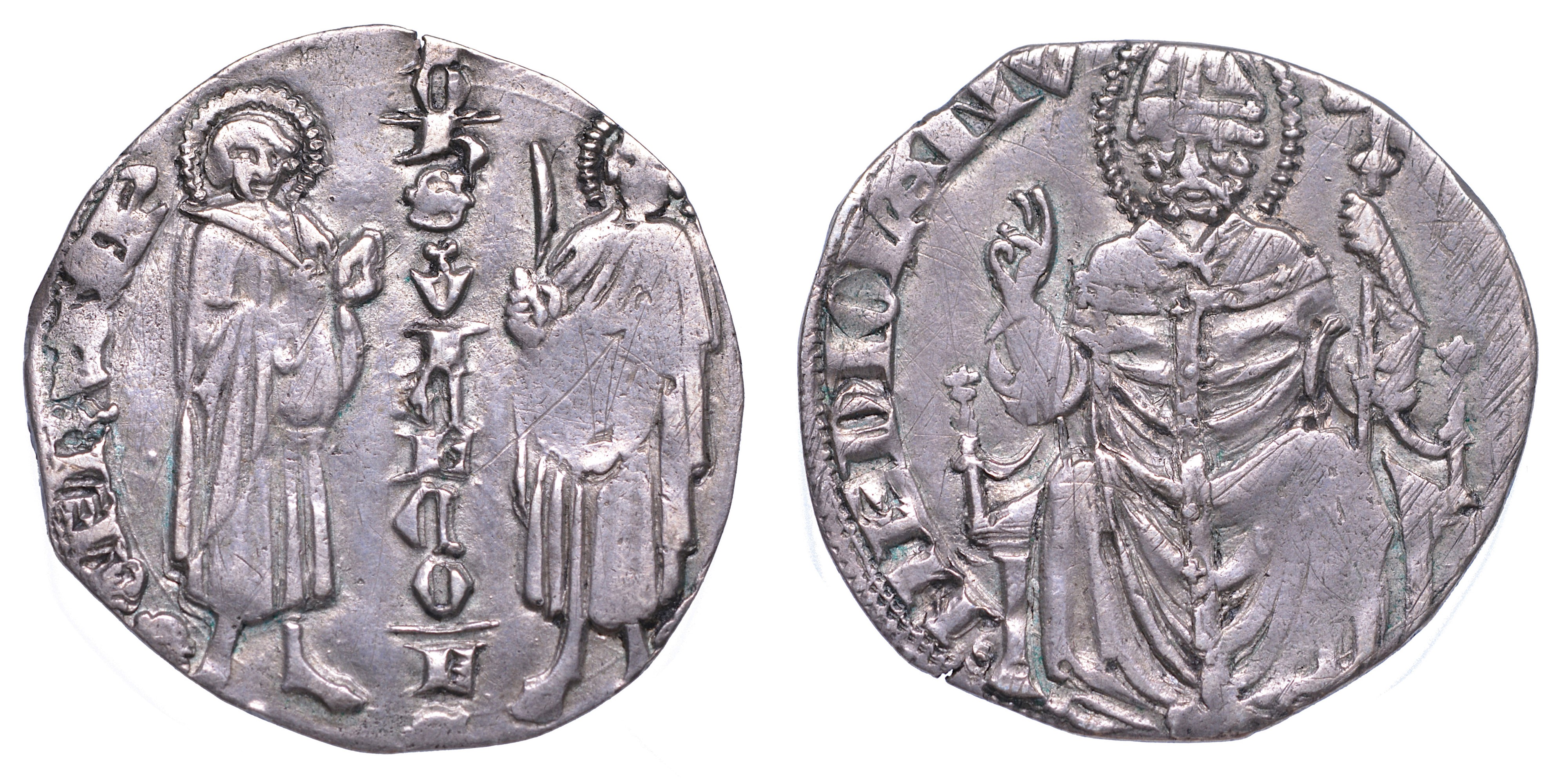 I santi Gervasio e Protasio nimbati, in piedi di prospetto; al centro, tra i due santi la scritta, posta verticalmente, IOHS VICECOES. R/ Sant’Ambrogio, mitrato e nimbato, in cattedra, seduto di prospetto, benedicente e con pastorale nella mano s. Crippa 1. MIR 97 (R2). Rara. g. 2,07. Diam. mm. 21,06. Arg. Tondello parzialmente tosato. MB/BB