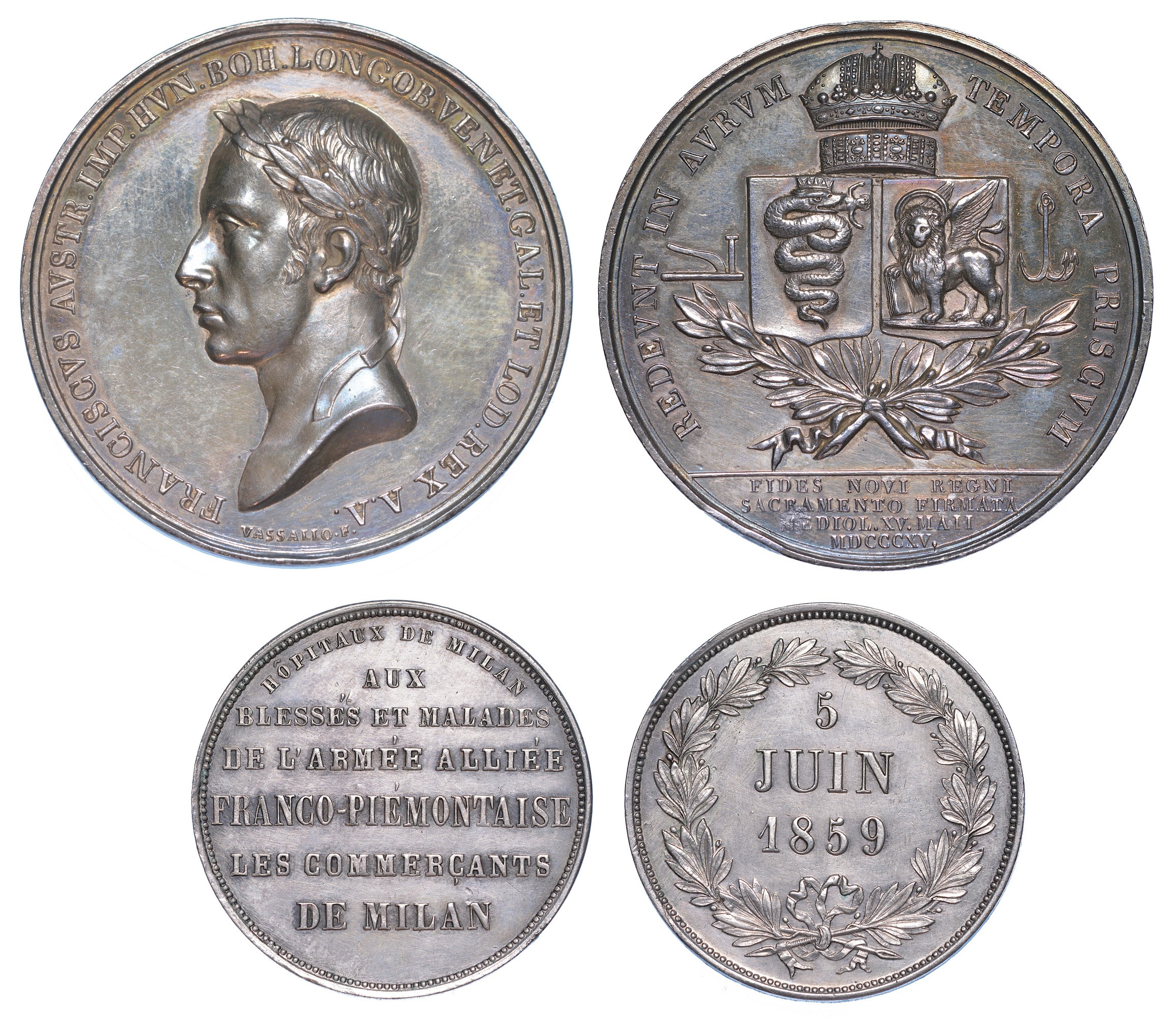 FRANCESCO I D'ASBURGO-LORENA, 1815-1835. Medaglia per il giuramento 1815. Opus Vassallo. Turricchia 4. Rara. g. 34,32. Diam. mm. 42,50. Arg. q.SPL (segni di contatto, colpo) - FRANCESCO GIUSEPPE I D'ASBURGO LORENA, 1848-1866. Medaglia 1859. Camozzi 1031. Turricchia 667. g. 12,76. Diam. mm. 30,98. Arg. BB/SPL