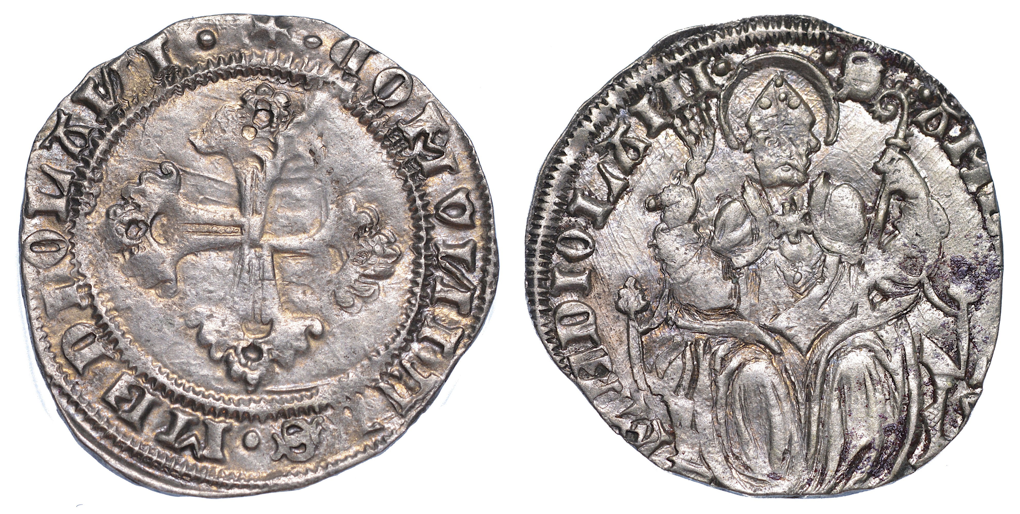 Croce fiorata. R/ Sant’Ambrogio, mitrato e nimbato, in cattedra, seduto di prospetto, con staffile e pastorale. Crippa 2. g. 2,21. Diam. mm. 23,65. Arg. BB/q.SPL