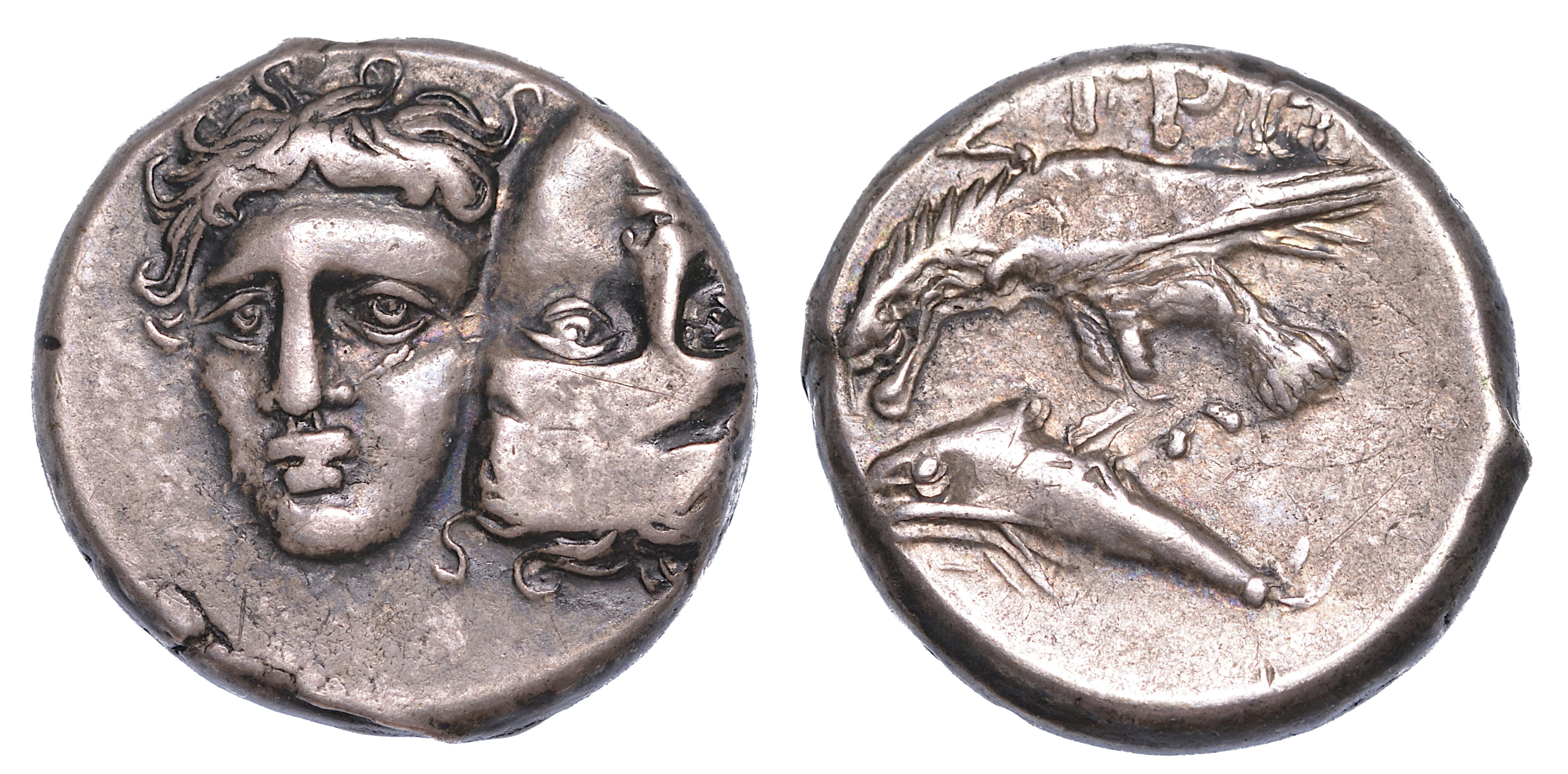 Due teste di giovani frontali, una capovolta. R/ Aquila afferra delfino con gli artigli. AMNG 432. SNG Black Sea 243. g. 5,80. Diam. mm. 16,25. Arg. q.BB