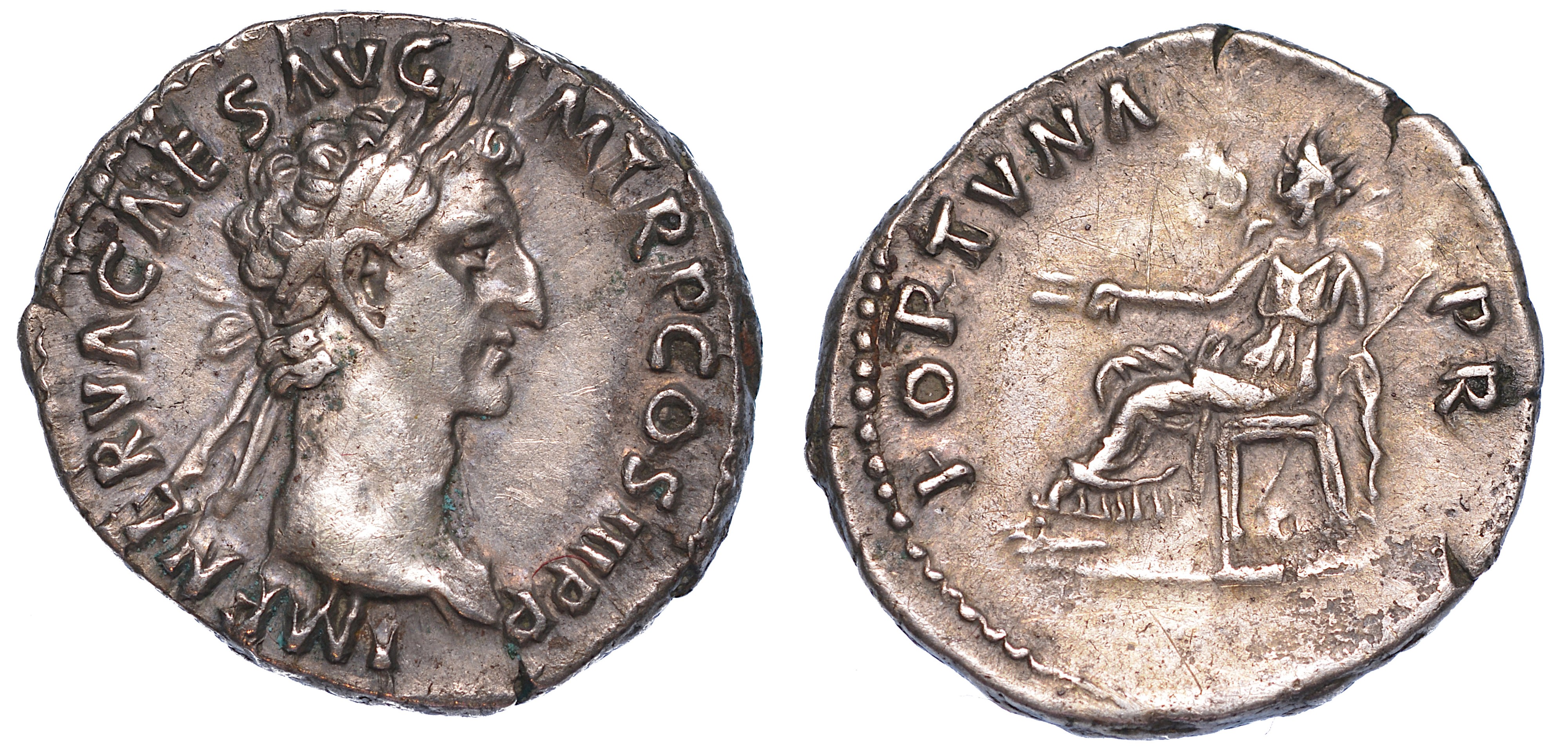 Testa laureata a d. R/ La Fortuna seduta a s. tiene spighe di grano e scettro trasversale. Coh. 79. RIC 17. g. 3,08. Diam. mm. 17,63. Arg. BB