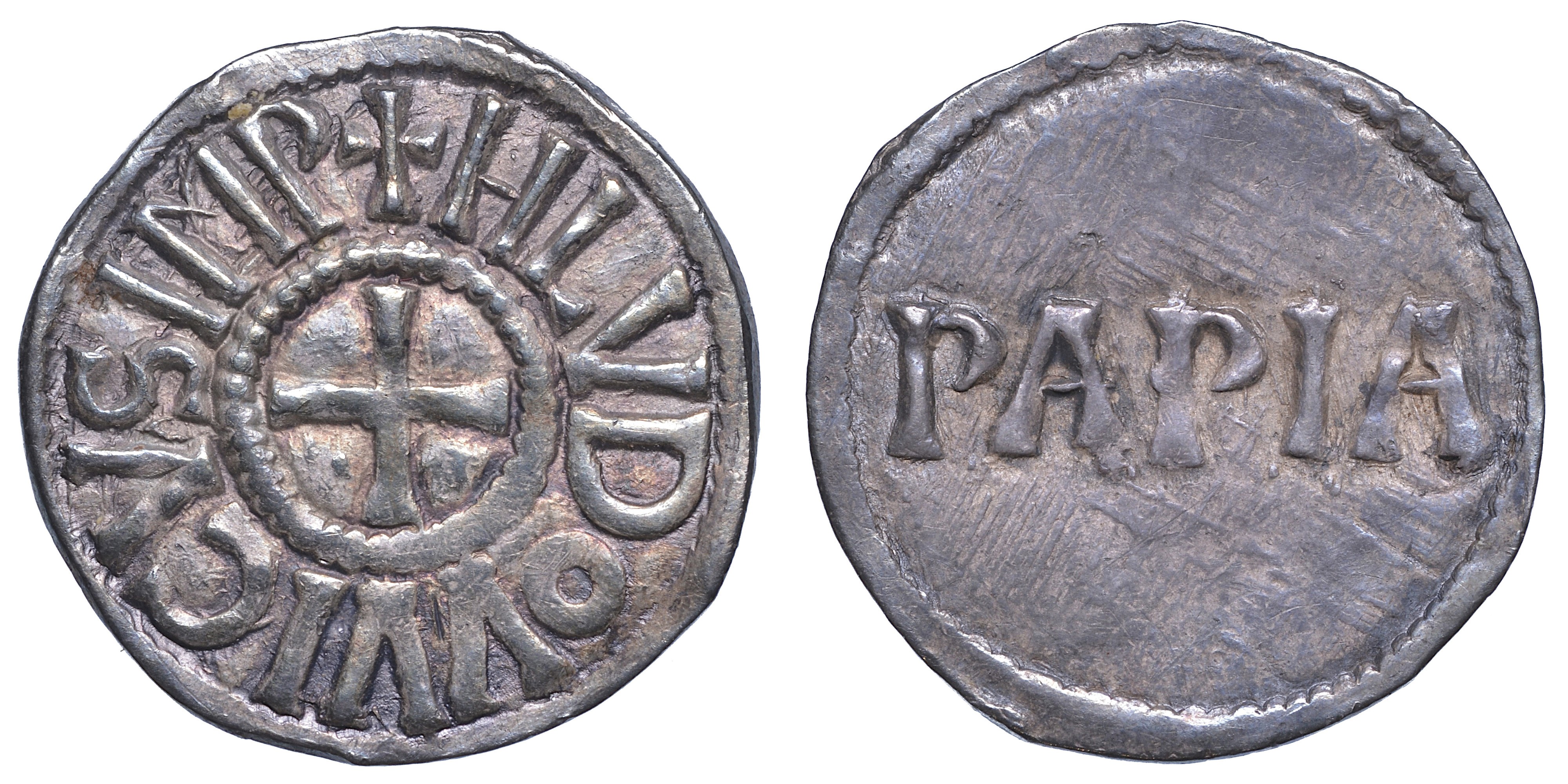 + HLVDOVVICVS IMP Croce patente. R/ Nel campo PAPIA. Morrison-Grunthal 447. MEC 1, 788. MIR 813. Raro. g. 1,80. Diam. mm. 20,32. Arg. q.BB