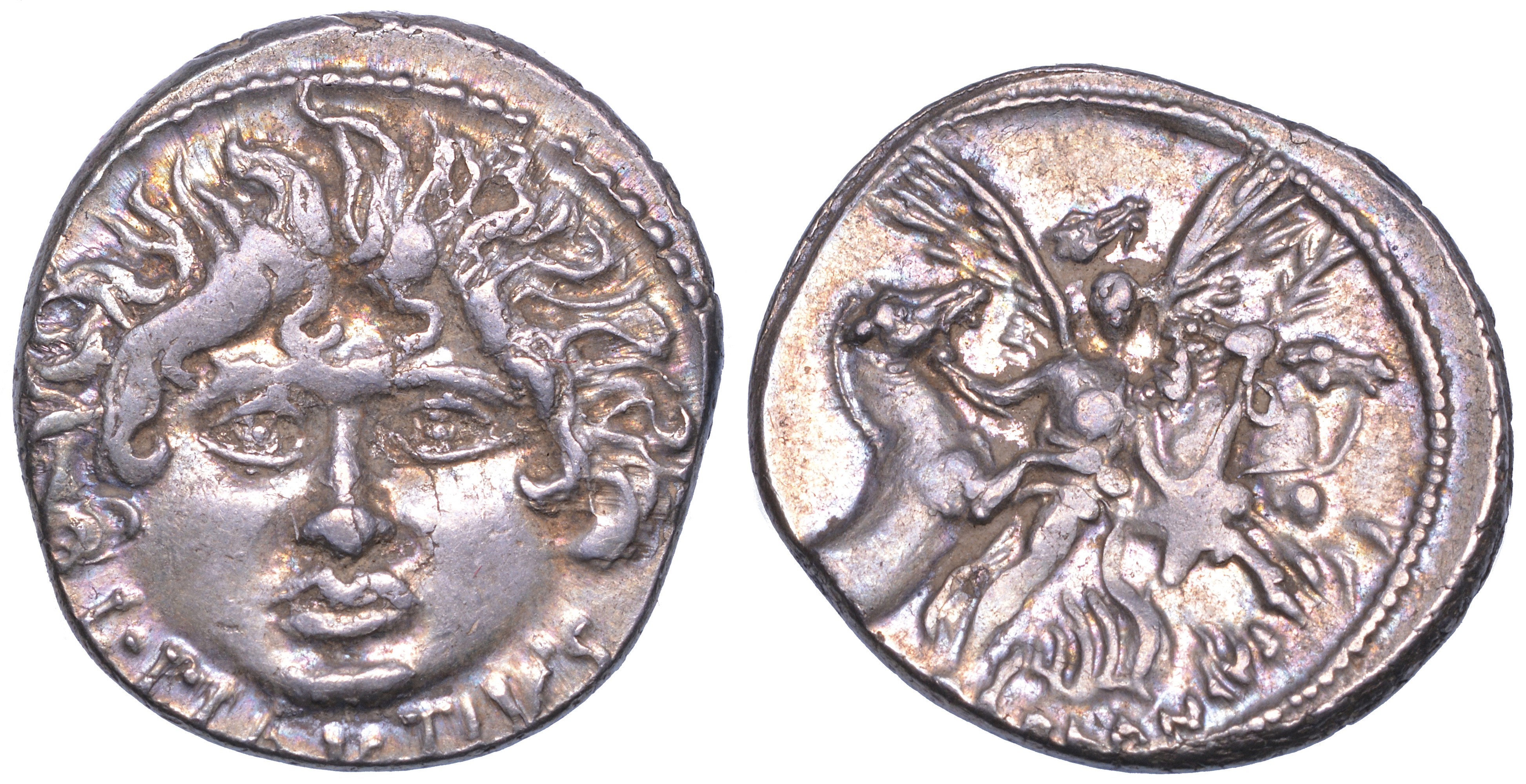 Volto frontale di Medusa. R/ Vittoria alata regge ramo di palma e conduce cavalli. Bab. Plautia 14. Syd. 959b. Cr. 453/1c. g. 3,97. Diam. mm. 19,51. Arg. Bellissimo esemplare. BB/q.SPL