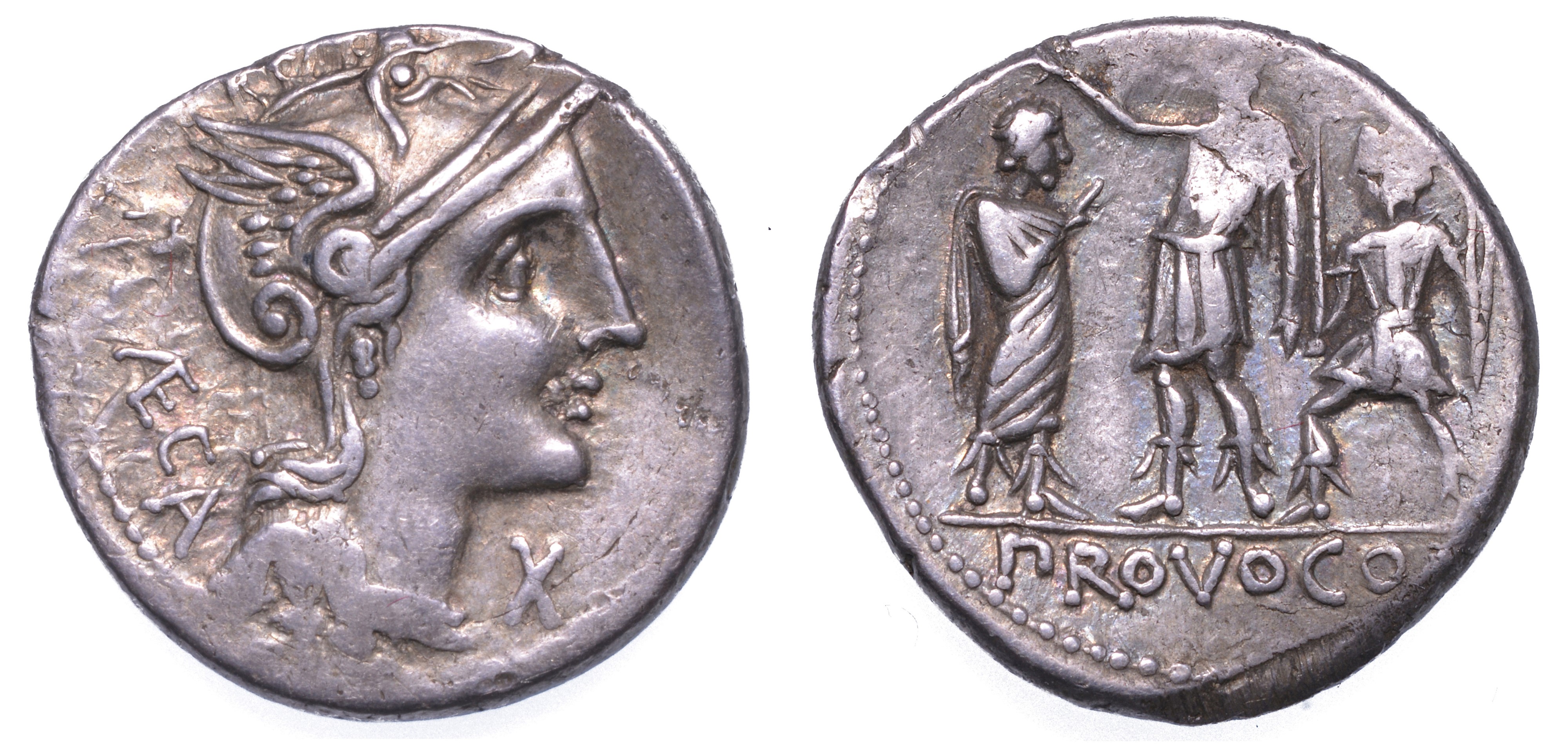 Testa di Roma a d. R/ Soldato romano seguito da un littore stende la mano sul capo di un cittadino. Bab. 4. Syd. 571. Cr. 301/1. g. 3,99. Diam. mm. 18,77. Arg. Tondello lievemente ondulato. BB