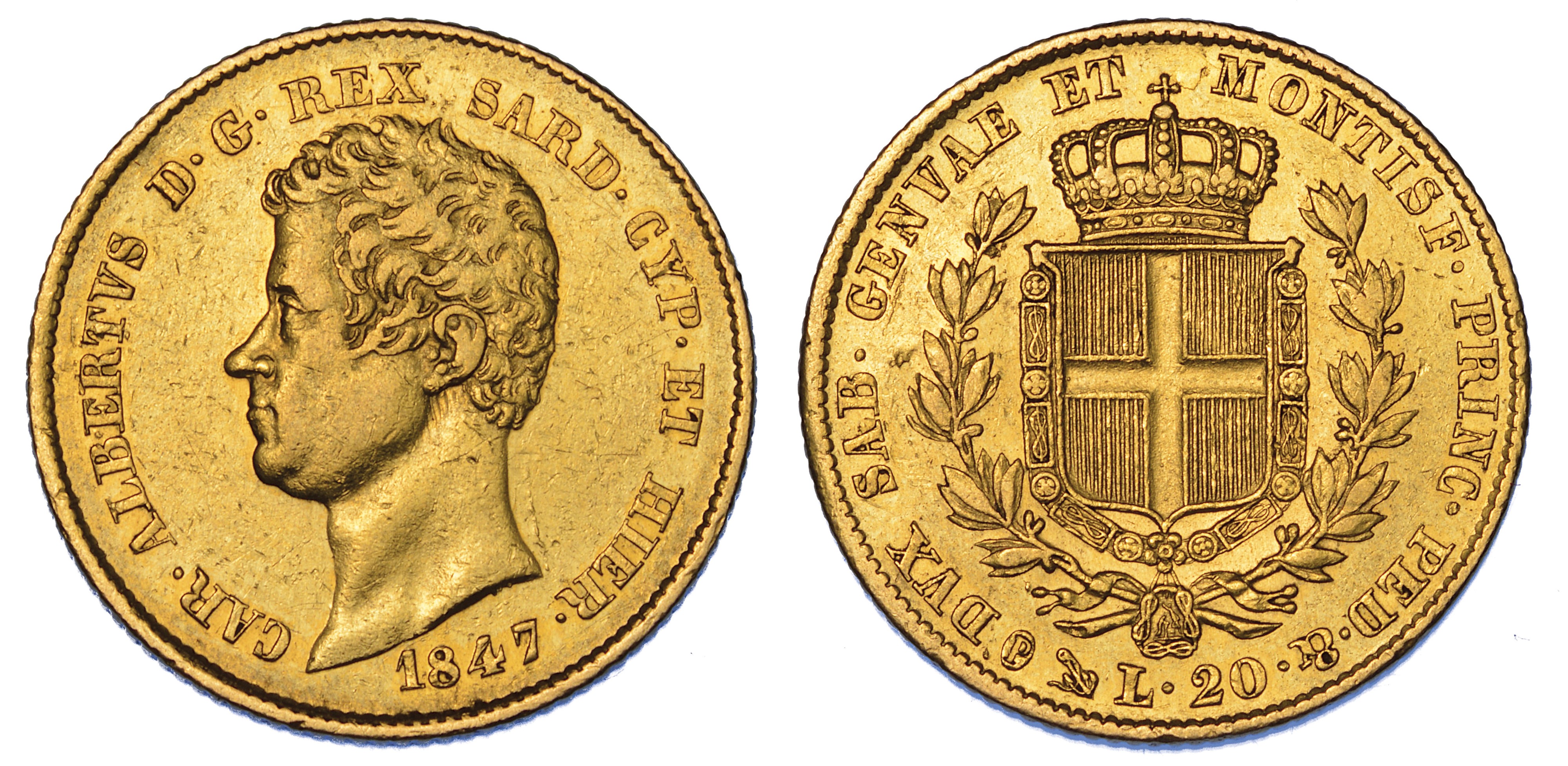 REGNO DI SARDEGNA. CARLO ALBERTO DI SAVOIA, 1831-1849. 20 Lire 1847. Genova.