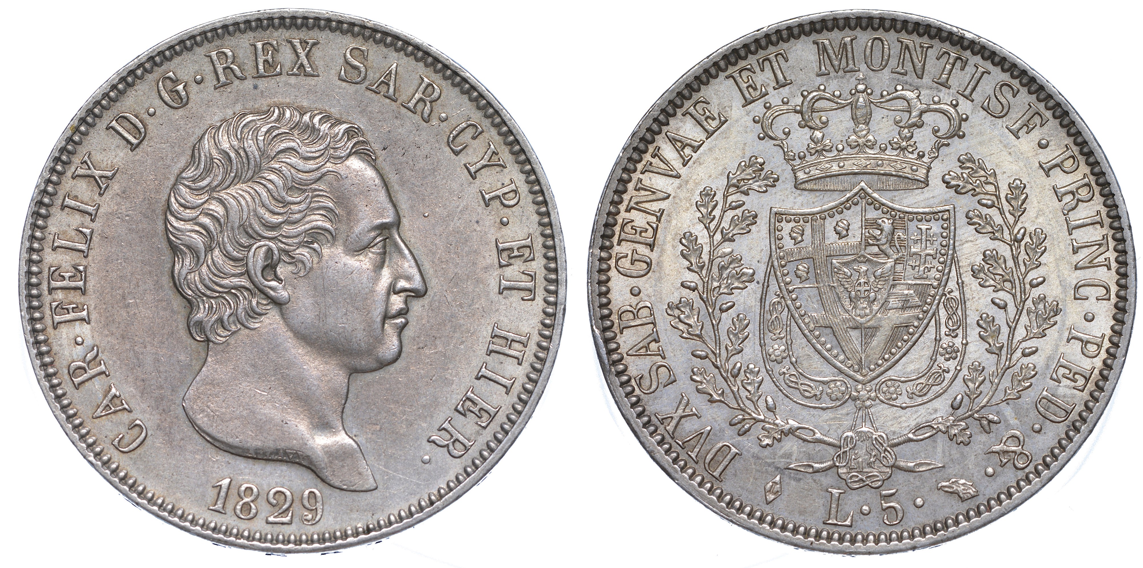 REGNO DI SARDEGNA. CARLO FELICE DI SAVOIA, 1821-1831. 5 Lire 1829. Torino.