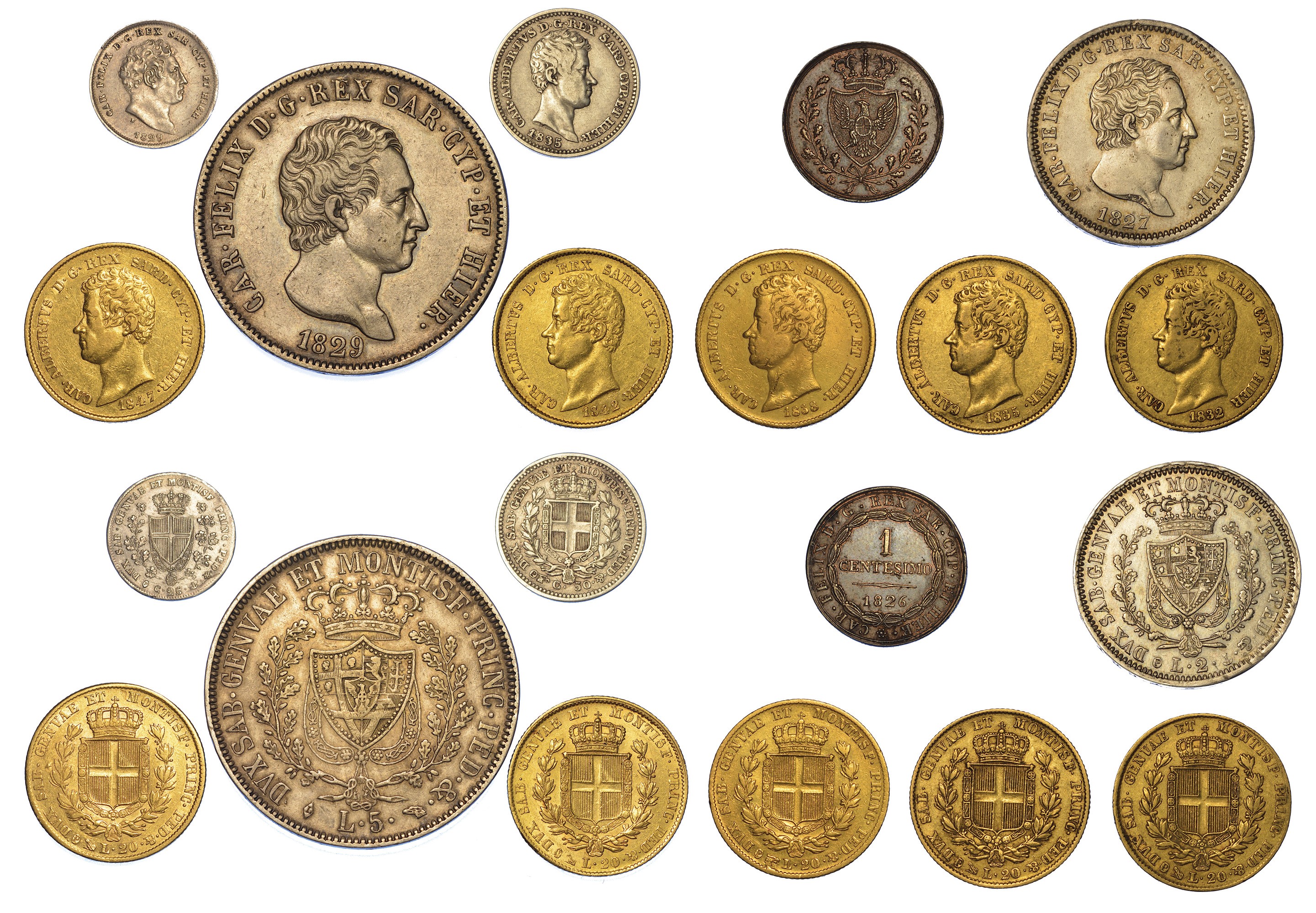 CARLO FELICE DI SAVOIA, 1821-1831. 5 Lire 1829 T - 2 Lire 1827 G - 25 Centesimi 1829 G (rara) - Centesimo 1826 T. CARLO ALBERTO DI SAVOIA, 1831-1849. 20 Lire 1832 G - 20 Lire 1835 G - 20 Lire 1838 T - 20 Lire 1842 G - 20 Lire 1847 G - 50 Centesimi 1835 T (rarissima). Esemplari in oro, argento e rame. Conservazioni da MB/BB a q.SPL.