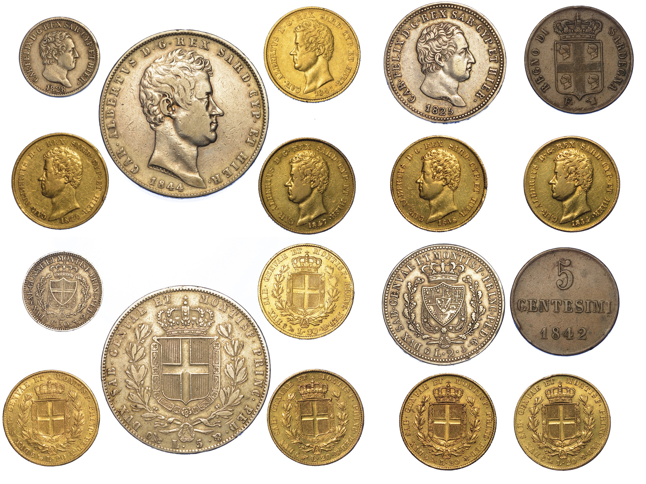 CARLO FELICE DI SAVOIA, 1821-1831. 2 Lire 1825 G (molto rara) - 50 Centesimi 1828 T. CARLO ALBERTO DI SAVOIA, 1831-1849. 20 Lire 1834 G - 20 Lire 1838 G - 20 Lire 1841 G - 20 Lire 1847 T - 20 Lire 1849 G - 5 Lire 1844 G - 5 Centesimi 1842 T (raro, cartellino Carlo Crippa). Esemplari in oro, argento e rame. Conservazioni da MB/BB a BB/SPL.
