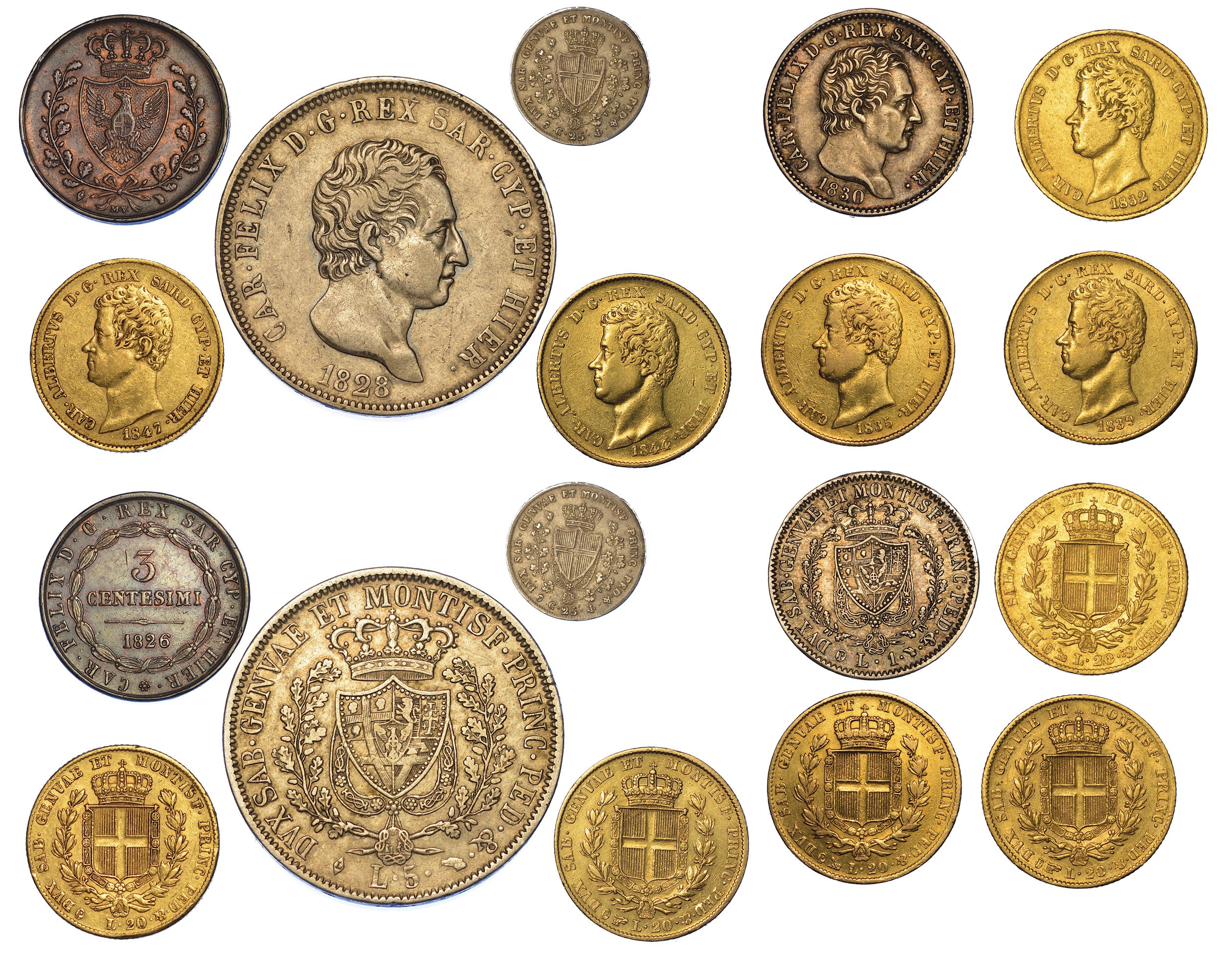 CARLO FELICE DI SAVOIA, 1821-1831. 5 Lire 1828 T - Lira 1830 T - 25 Centesimi 1829 G (rara) - 3 Centesimi 1826 T. CARLO ALBERTO DI SAVOIA, 1831-1849. 20 Lire 1832 G - 20 Lire 1835 G - 20 Lire 1839 T - 20 Lire 1844 T - 20 Lire 1847 senza marchio di zecca (molto rara). Esemplari in oro, argento e rame. Conservazioni da MB/BB a BB/SPL.