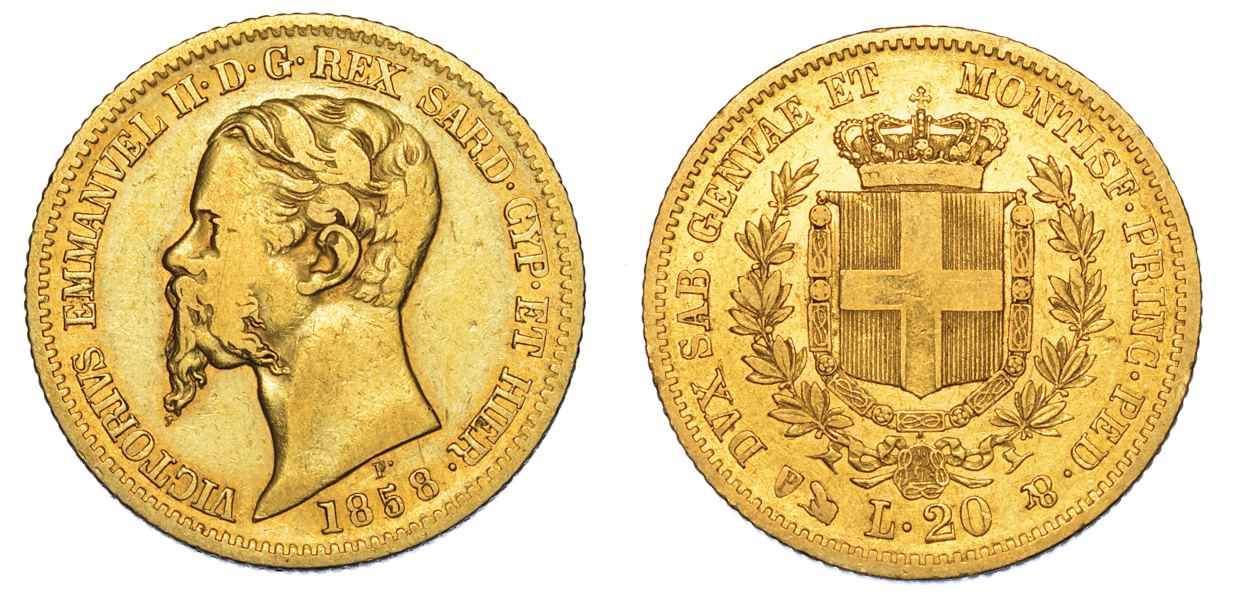REGNO DI SARDEGNA. VITTORIO EMANUELE II DI SAVOIA, 1849-1861. 20 Lire 1858. Genova.