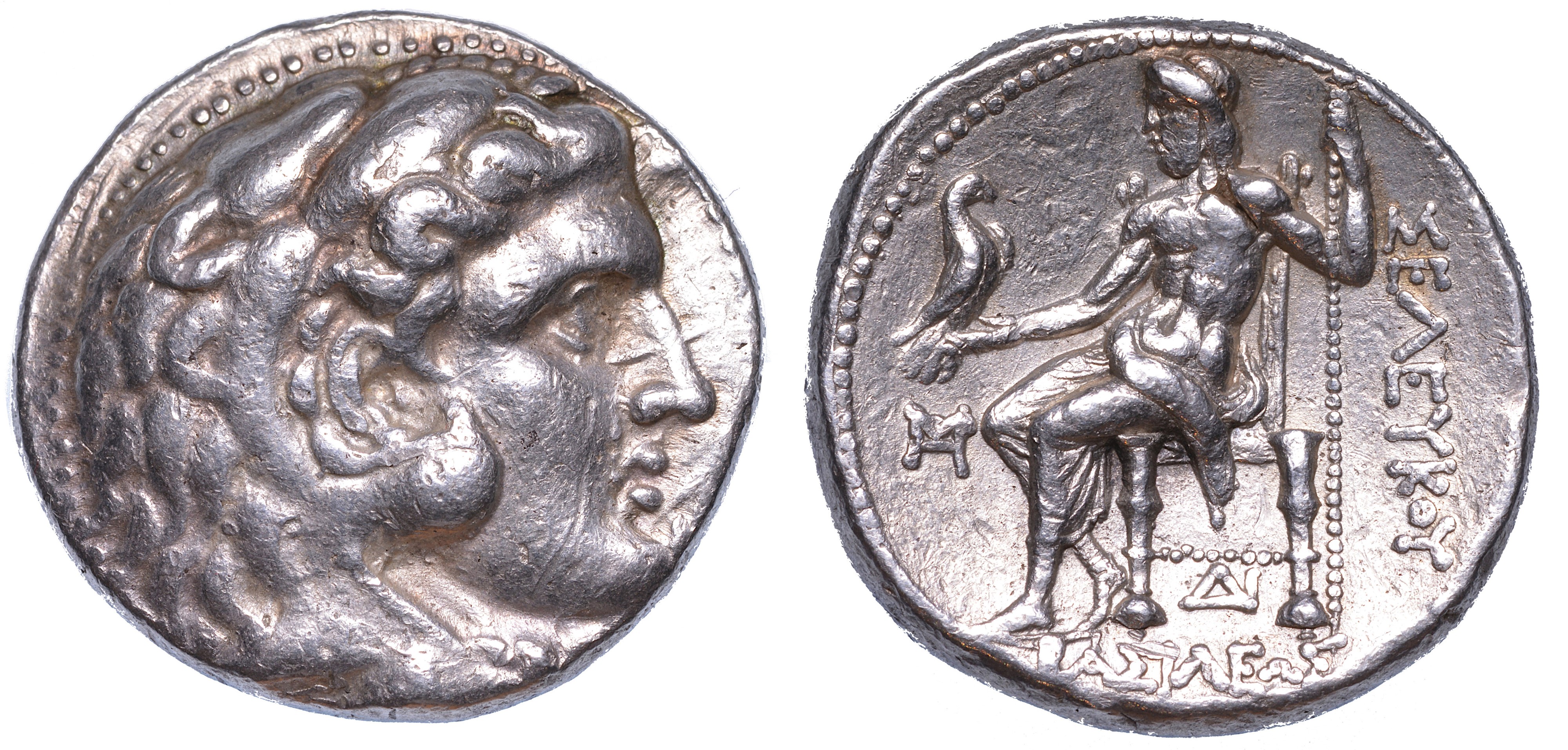 Testa di Eracle a d. con copricapo di pelle di leone. R/ Zeus seduto in trono con aquila e scettro; sotto il trono, monogramma. SC 117.1c. BMC IV/1/5. g. 17,02. Diam. mm. 25,93. Arg. Buon BB