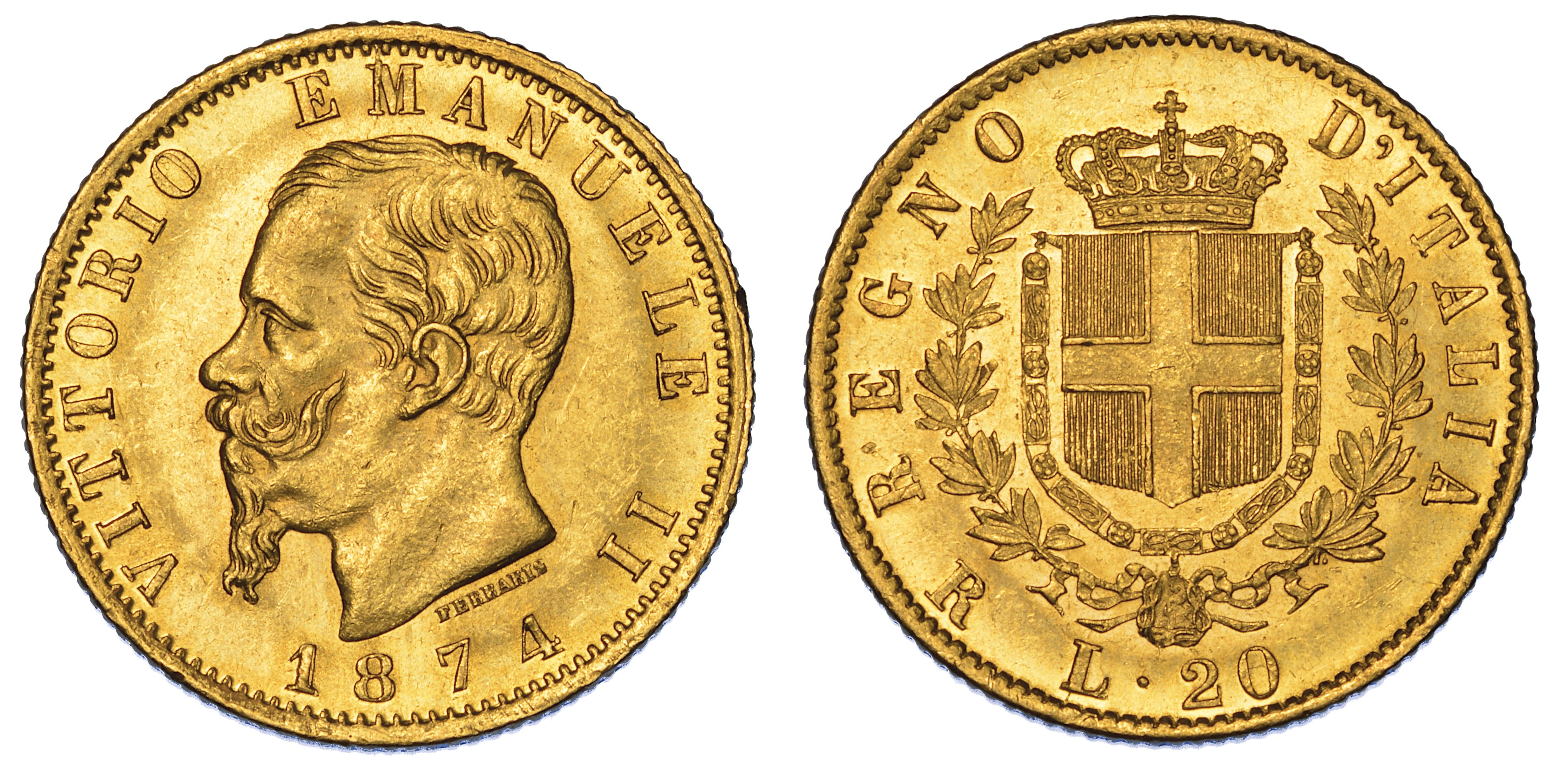 REGNO D'ITALIA. VITTORIO EMANUELE II DI SAVOIA, 1861-1878. 20 Lire 1874. Roma.