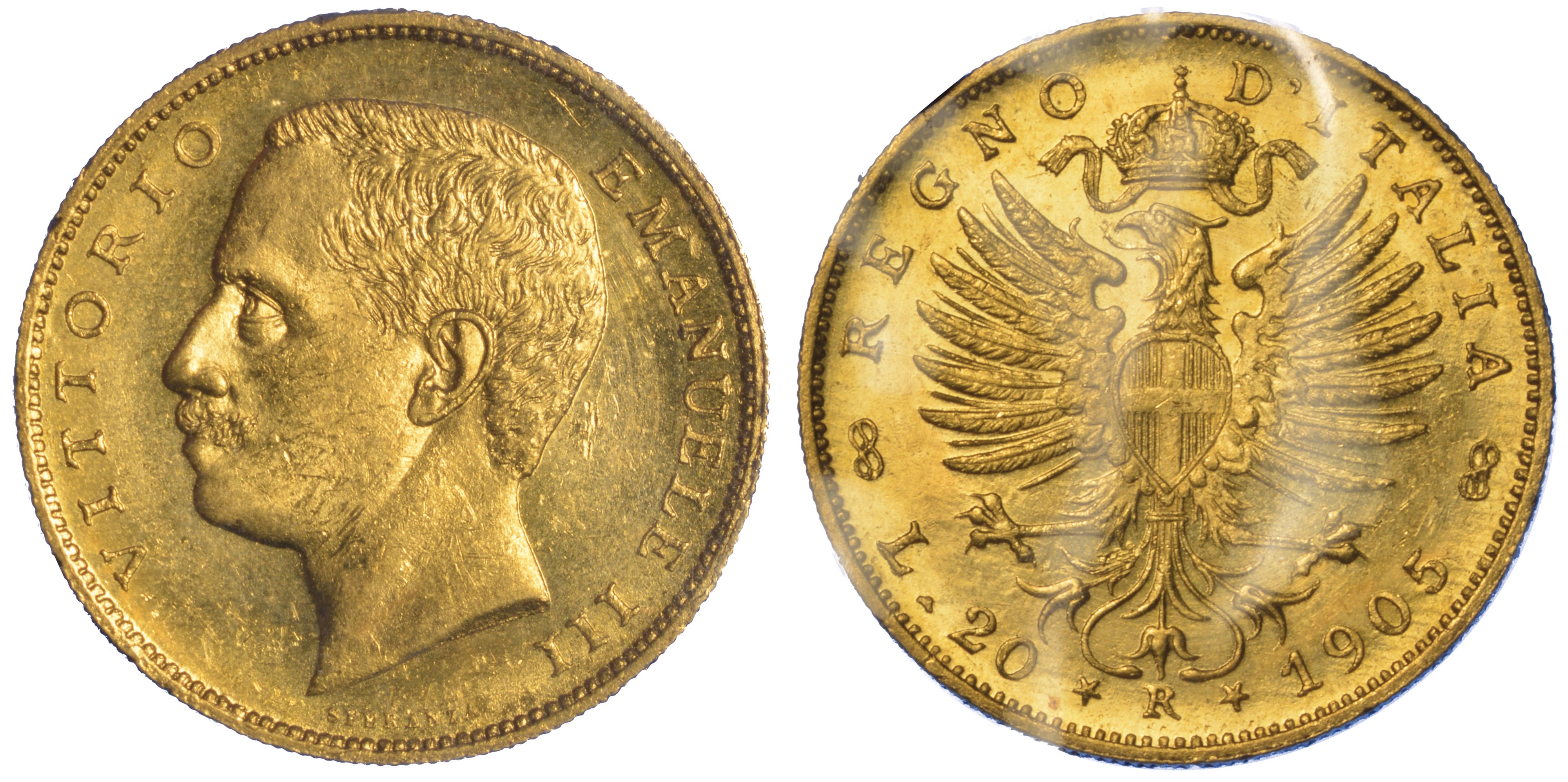 REGNO D'ITALIA. VITTORIO EMANUELE III DI SAVOIA, 1900-1946. 20 Lire 1905. Aquila.