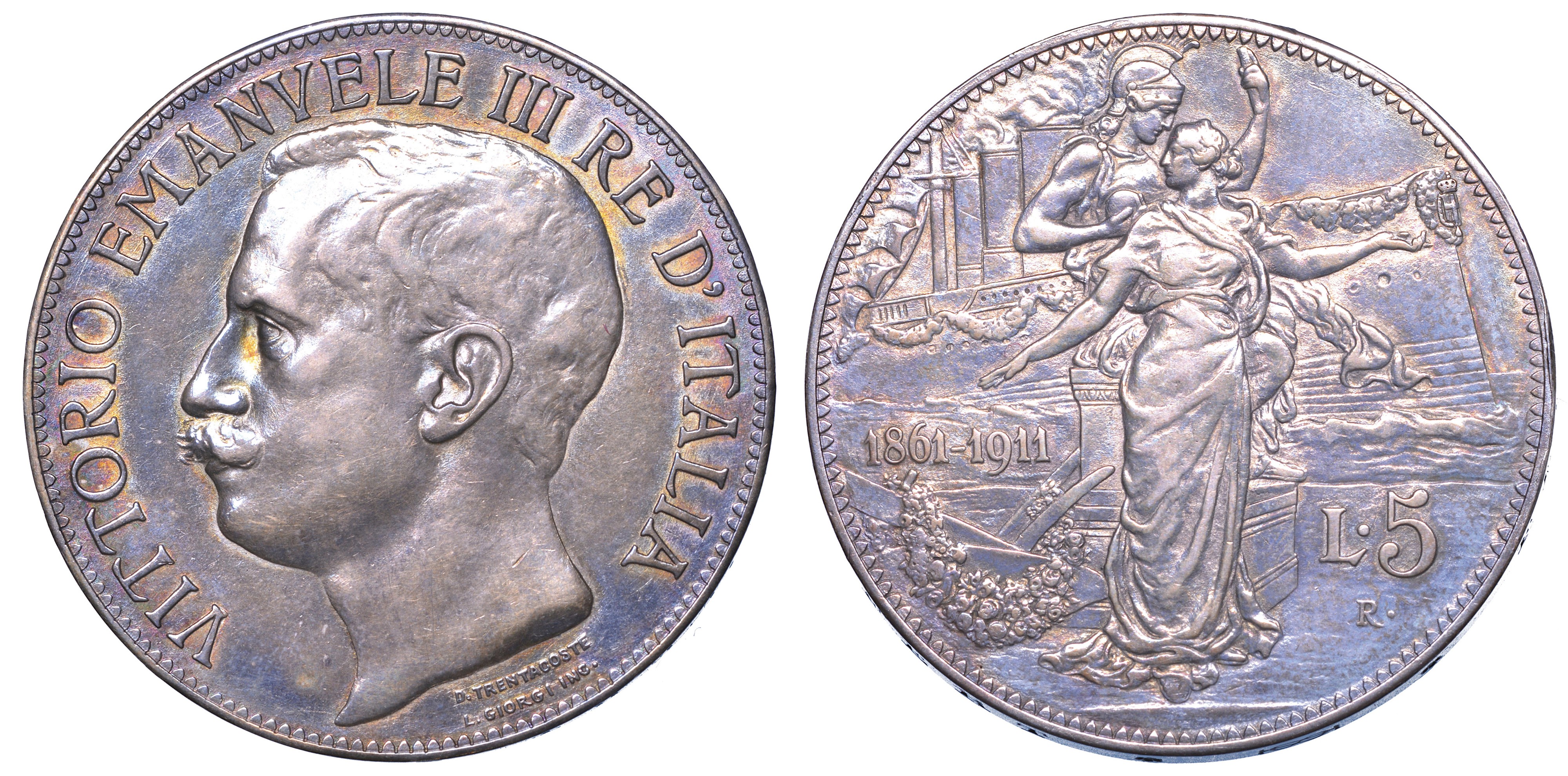 REGNO D’ITALIA. VITTORIO EMANUELE III DI SAVOIA, 1900-1946. 5 Lire 1911. Cinquantenario.
