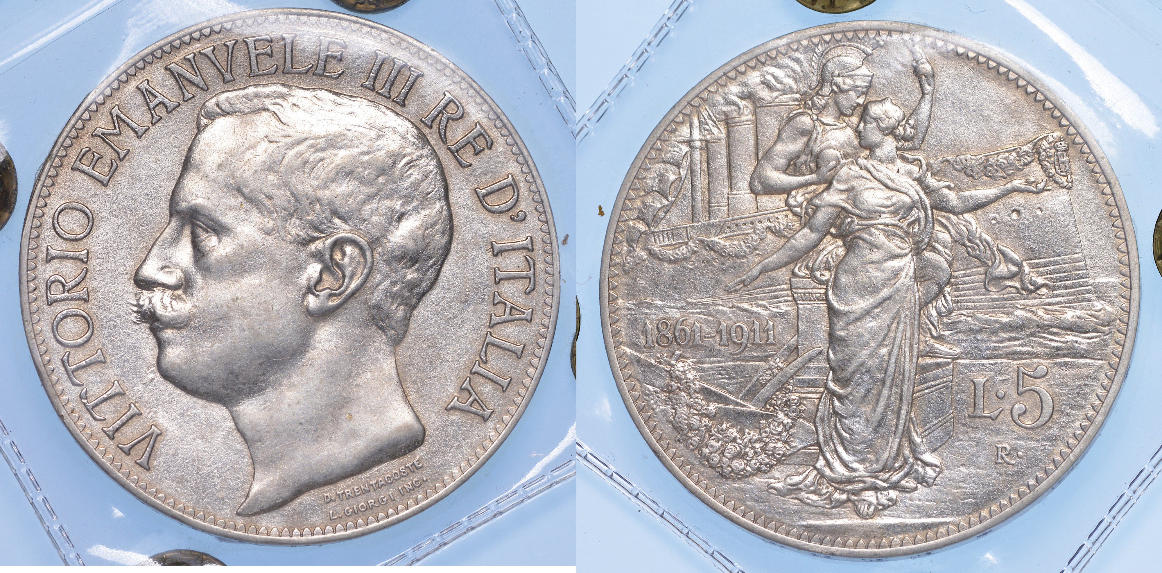 REGNO D’ITALIA. VITTORIO EMANUELE III DI SAVOIA, 1900-1946. 5 Lire 1911. Cinquantenario.