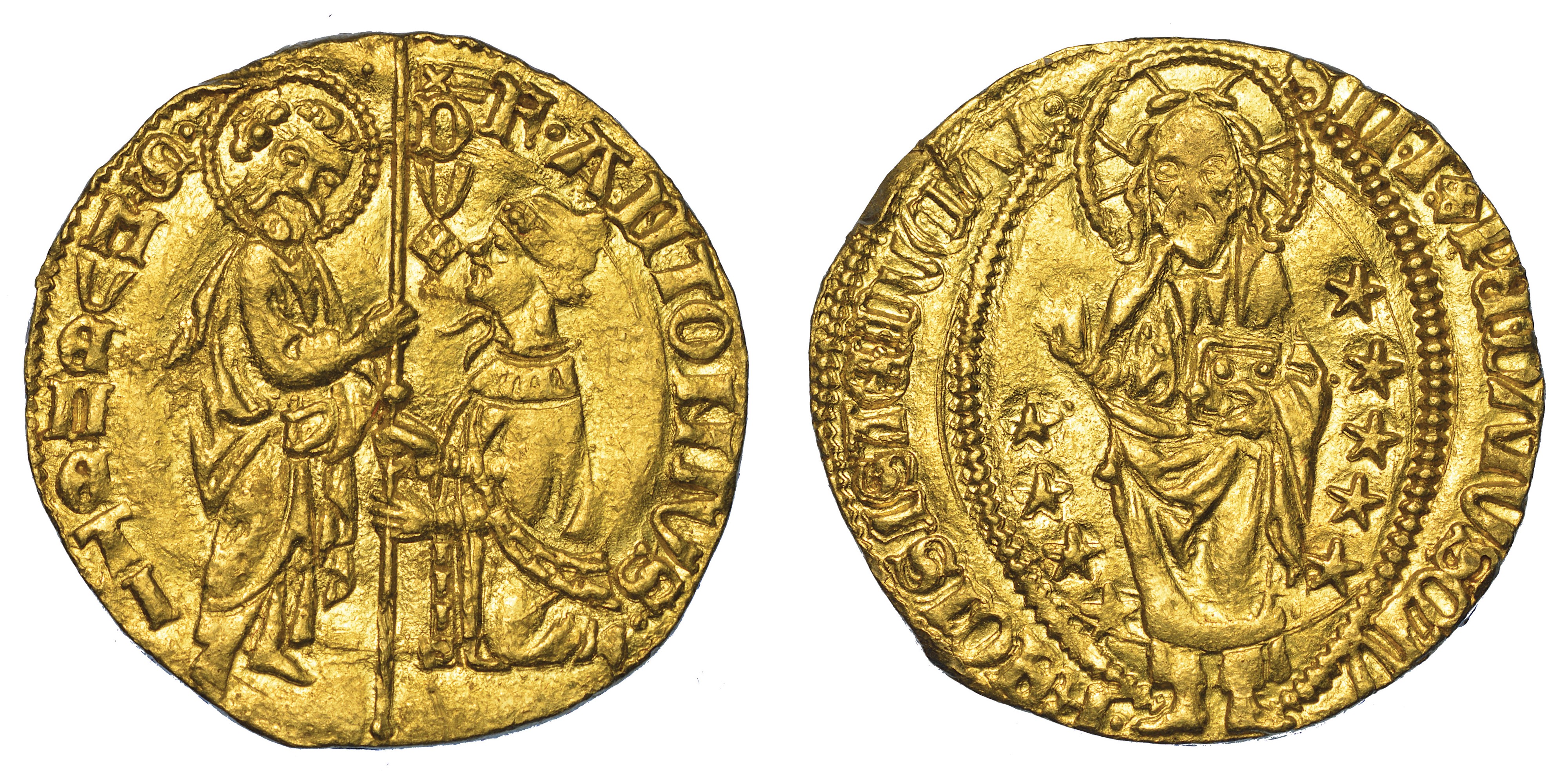 Il Santo in piedi porge il vessillo al doge genuflesso. R/ Il Redentore in piedi in aureola ellittica. Gamb. 375. g. 3,54. Diam. mm. 20,57. Oro. q.SPL