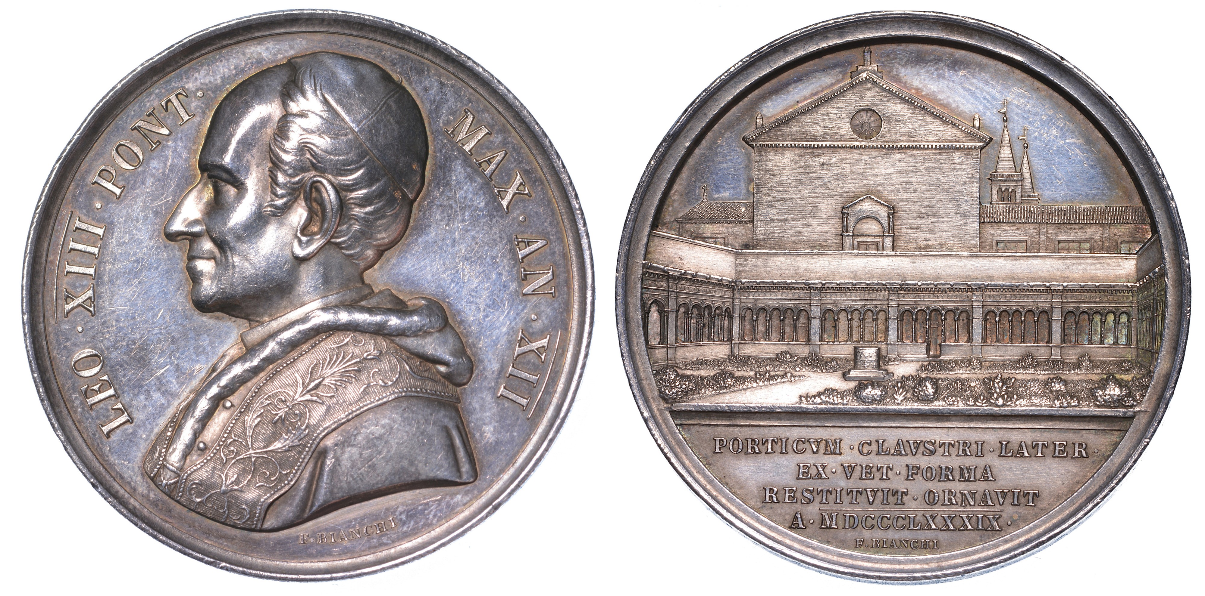 Busto a s. con berretto, mozzetta e stola. R/ Prospetto del Chiostro lateranense. Bart. E889. g. 35,80. Diam. mm. 43,58. Arg. Colpetti. SPL