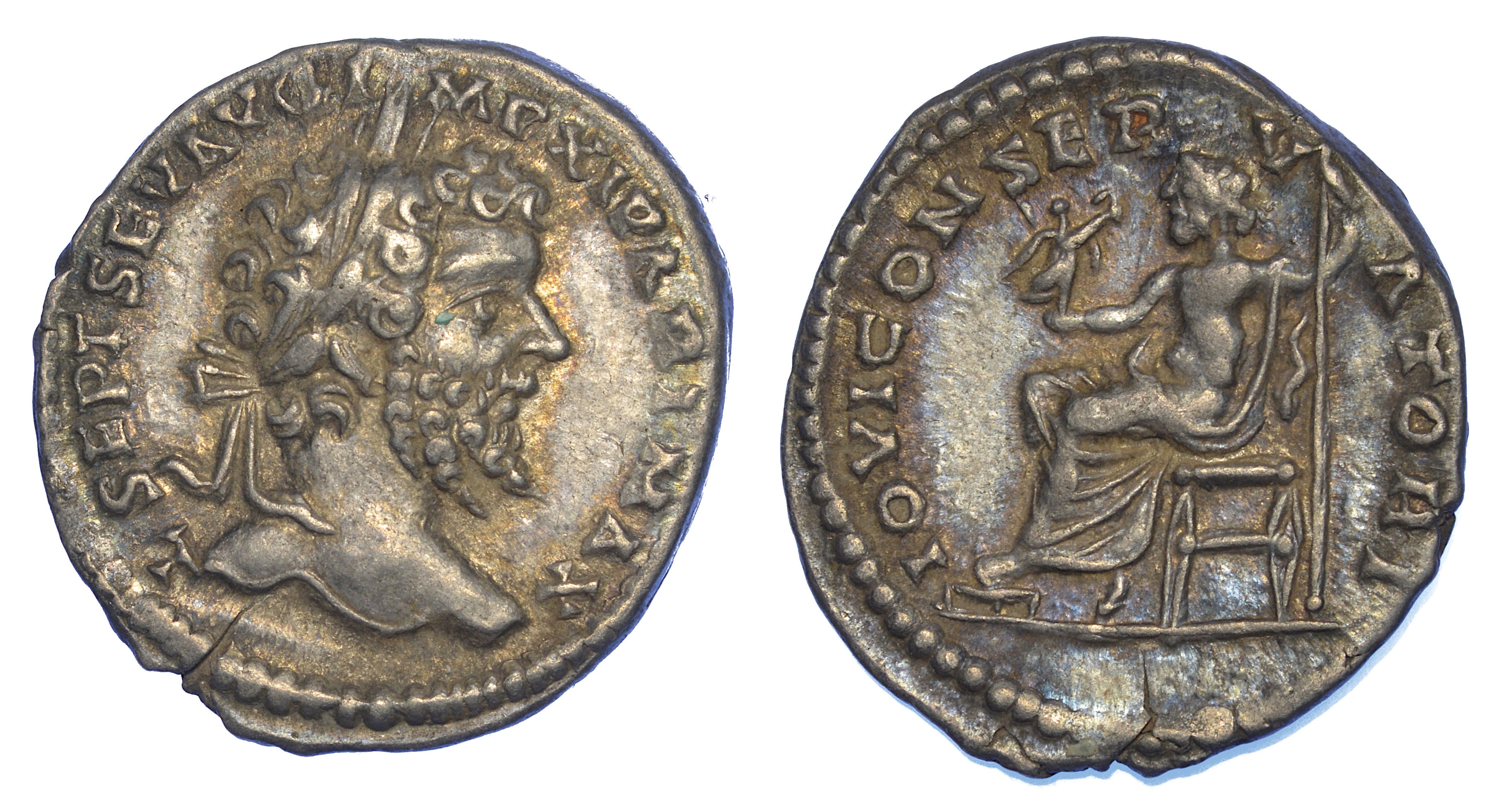 Testa laureata a d. R/ Giove seduto in trono regge Vittoriola e lungo scettro. RIC 130. Coh. 237. g. 2,57. Diam. mm. 18,23. Arg. Lieve iridescenza. q.SPL