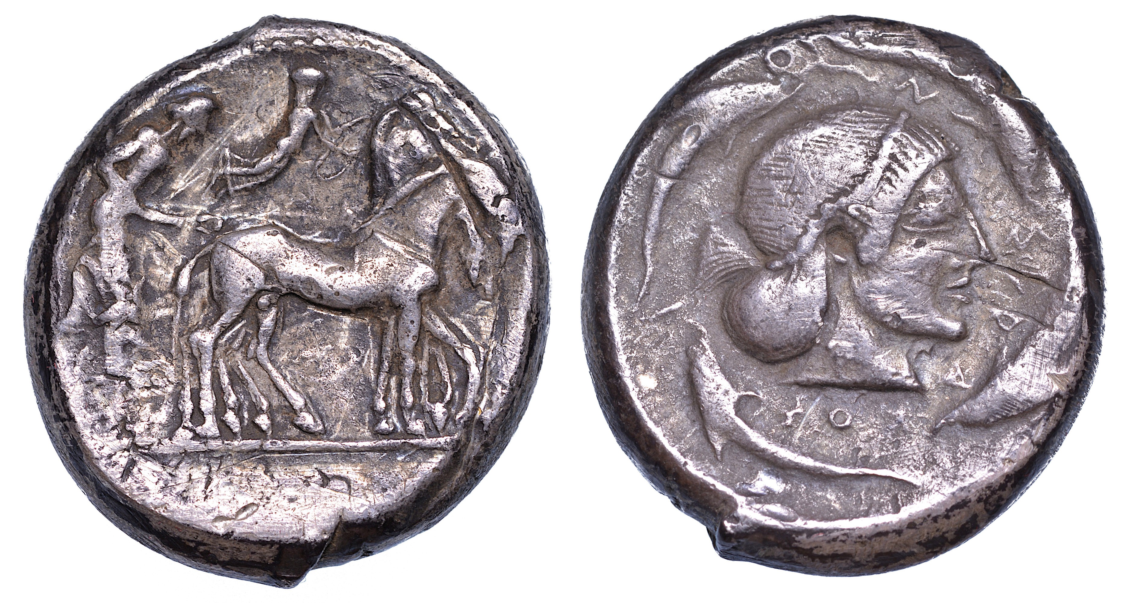 Quadriga lenta guidata verso d. dall'auriga; sopra, Nike in volo a d. incorona i cavalli. R/ Testa della ninfa Aretusa a d., capelli legati con fila di perline e diadema; intorno, quattro delfini nuotano in senso orario; intorno, scritta SIRACOSION in lettere greche. Sear 913. Boehringer 114. g. 17,01. Diam. mm. 24,85. Arg. Graffi e limature sul contorno. MB/BB