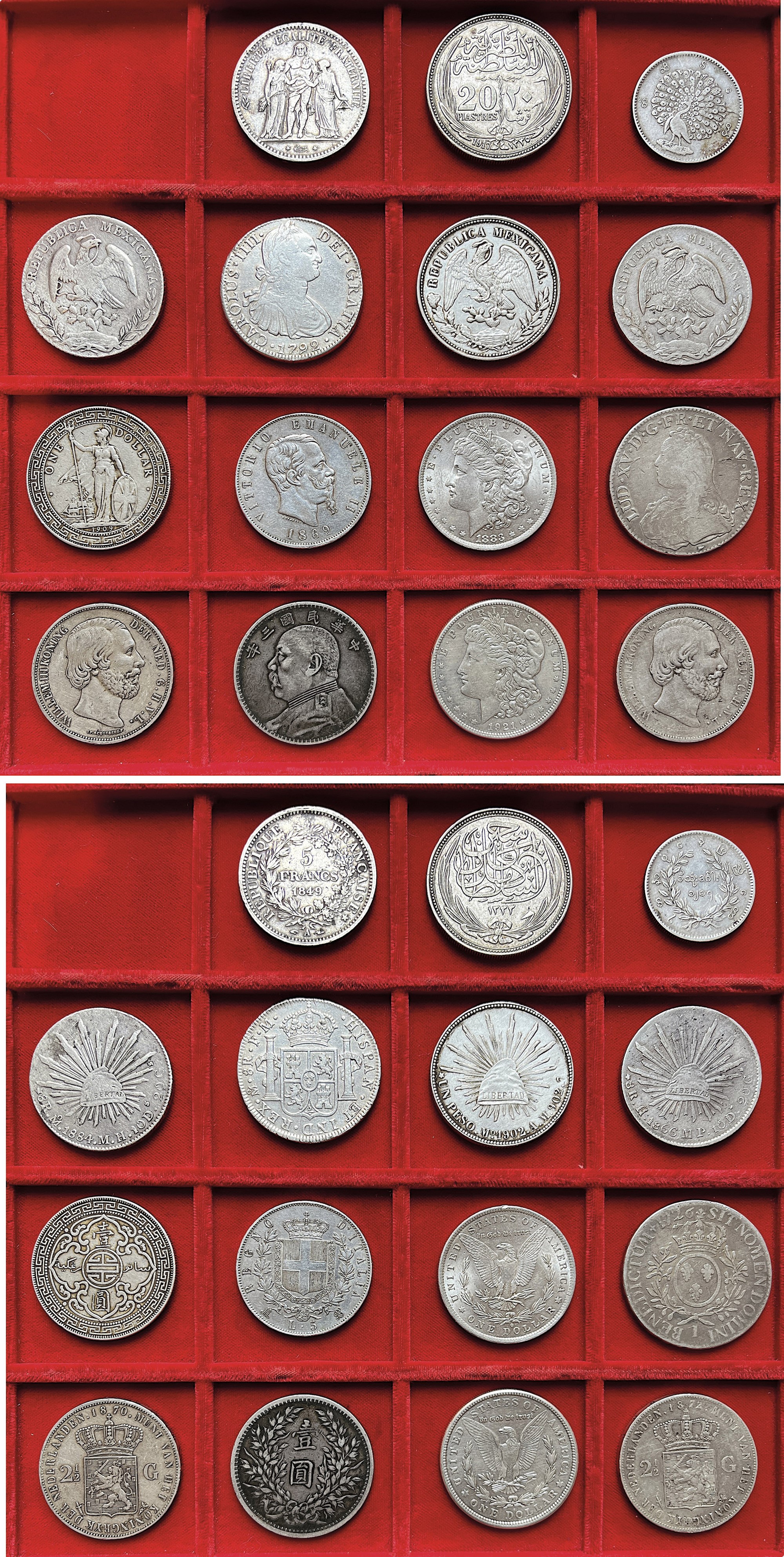Monetazione mondiale mista dal XVIII al XX secolo. Si segnalano esemplari dei seguenti Stati: Cina, Francia, Italia (Regno), Messico, Paesi Bassi, Regno Unito, USA. Esemplari in argento. Conservazioni da MB a q.SPL. Interessante lotto da visionare.