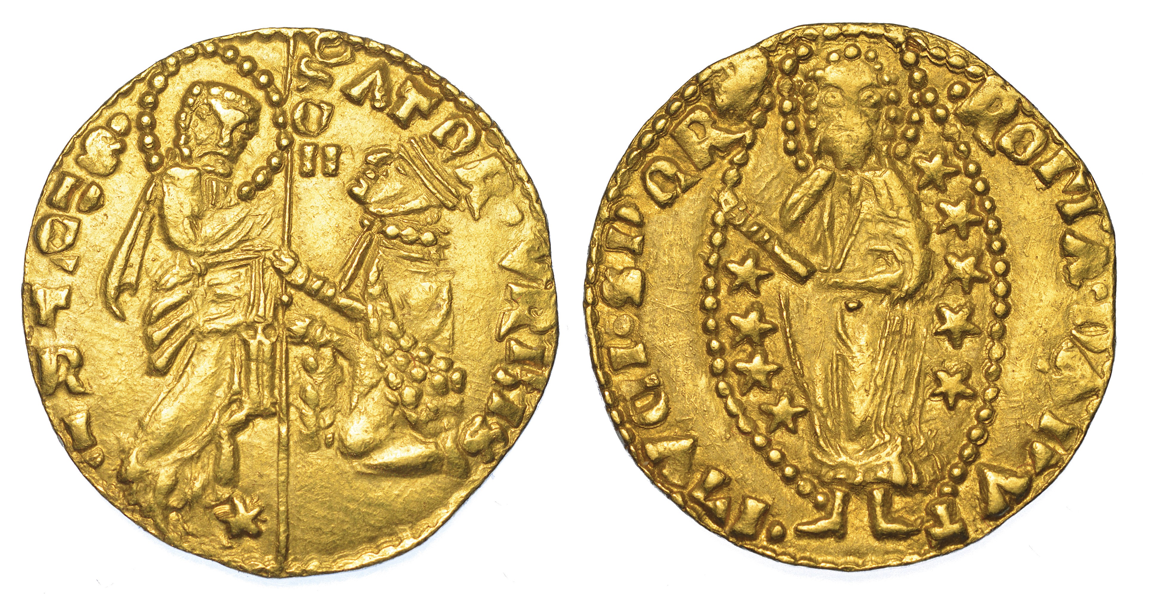 San Pietro in piedi porge il vessillo al papa genuflesso; ai piedi del Santo, una stella. R/ Il Redentore in piedi in aureola ellittica. CNI 531. Gamb. 390. MIR 177/6 (R3). Rara. g. 3,55. Diam. mm. 20,49. Oro. BB