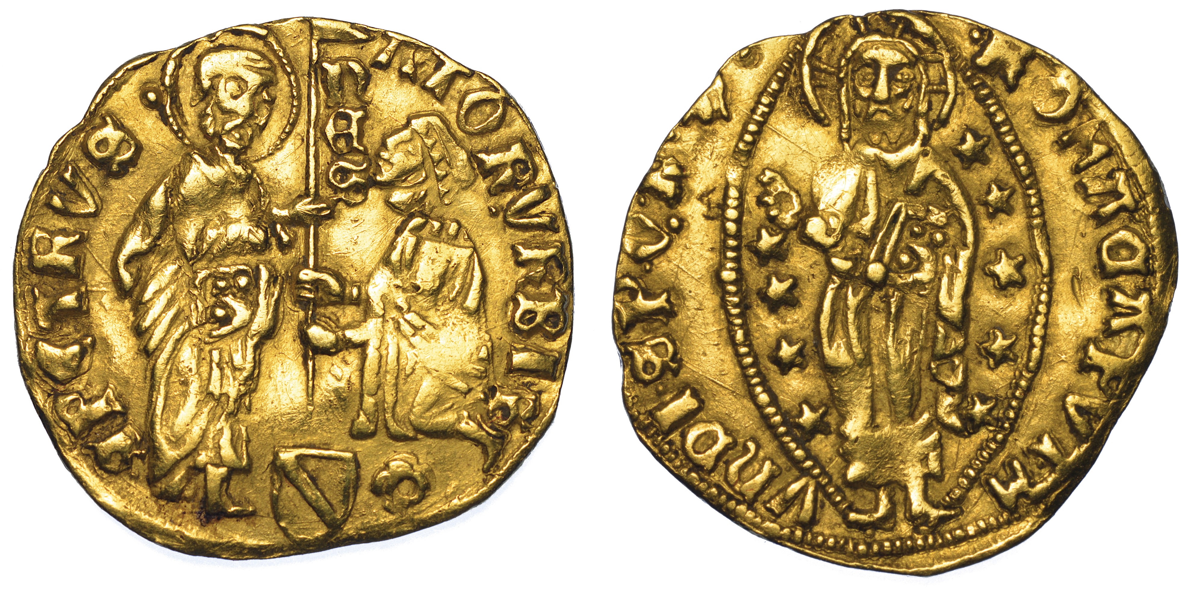 San Pietro nimbato stante, nell'atto di consegnare il vessillo al senatore genuflesso davanti a lui. Alla base del vessillo stemma Condulmer. R/ Figura del Redentore in ellisse. Munt. 134. MIR 179/27 (R2). g. 3,42. Diam. mm. 20,54. Oro. q.BB