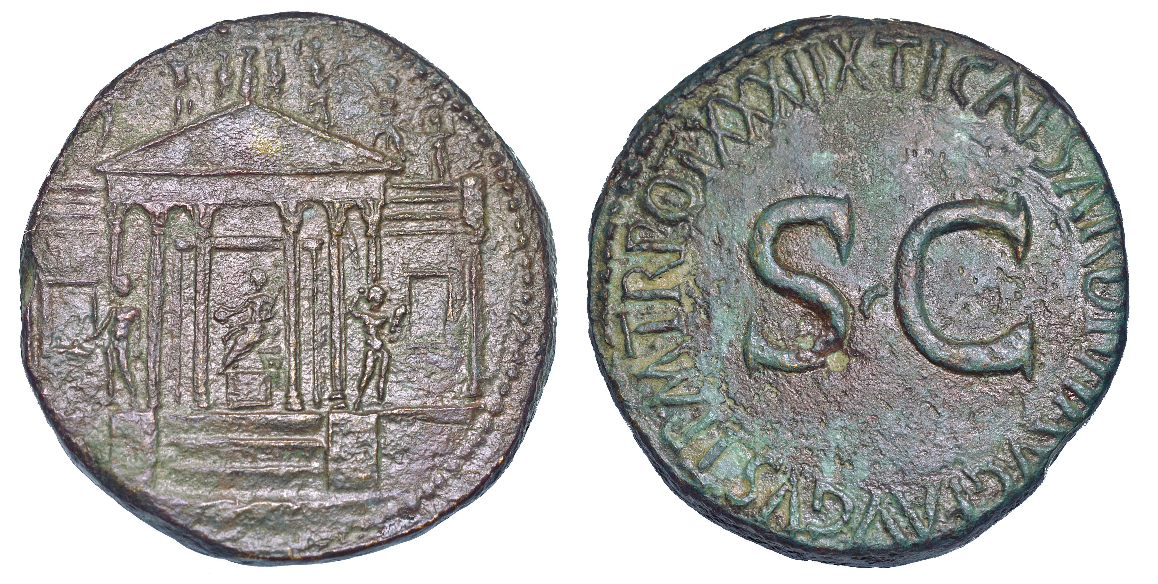 Tempio esastilo con all’interno le statue della Concordia, di Ercole e Mercurio. Sopra il frontone, statue di Giove, Giunone e Minerva e di altre figure. R/ Nel campo S C. Coh. 70. RIC 61. Raro. g. 26,28. Diam. mm. 33,44. Bronzo. Patina verde marrone. BB/SPL