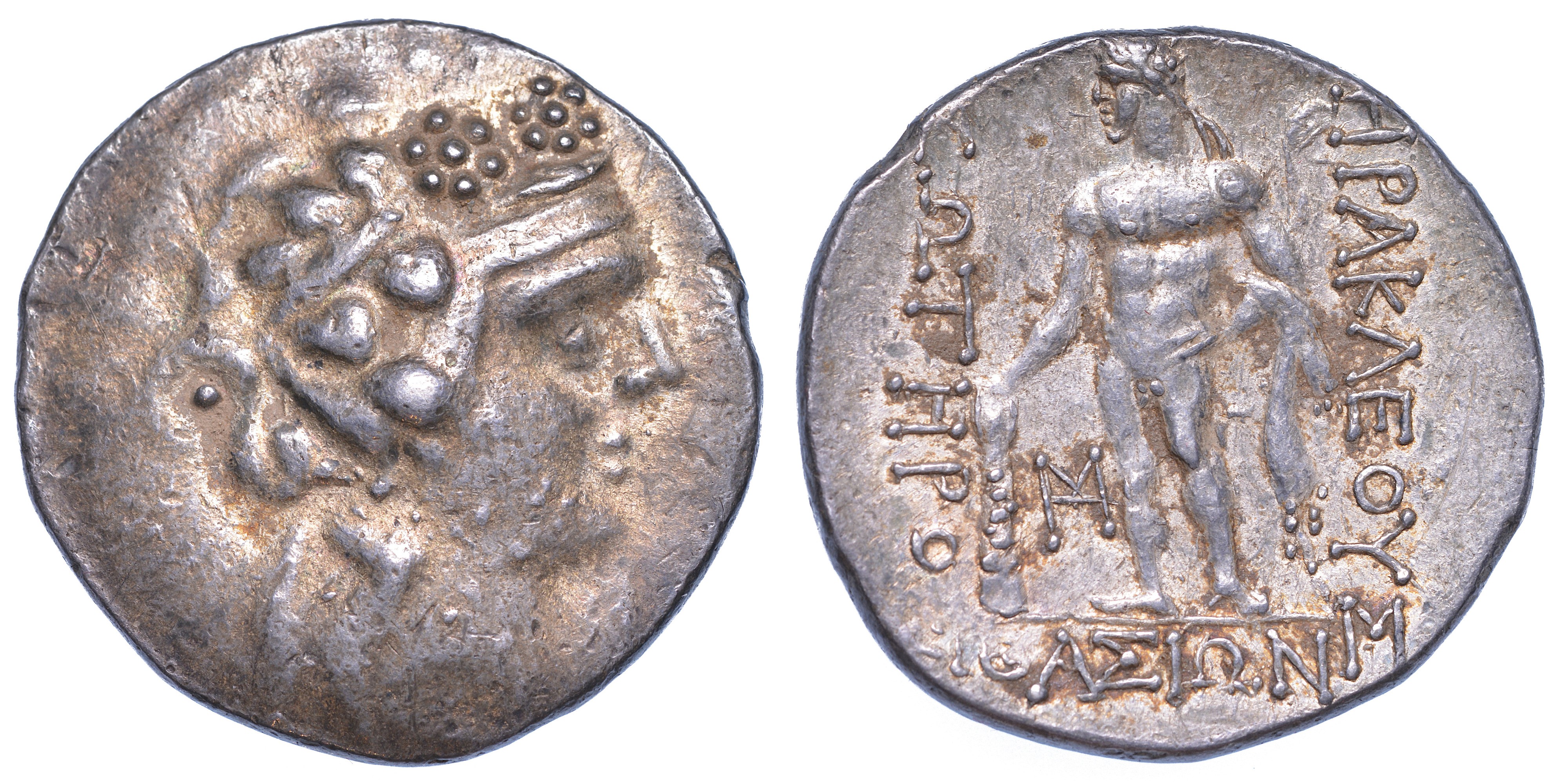 Testa di Dioniso a d. con ghirlanda di edera. R/ Eracle stante regge leontè e clava. Sear 1759. g. 16,85. Diam. mm. 31,18. Arg. BB