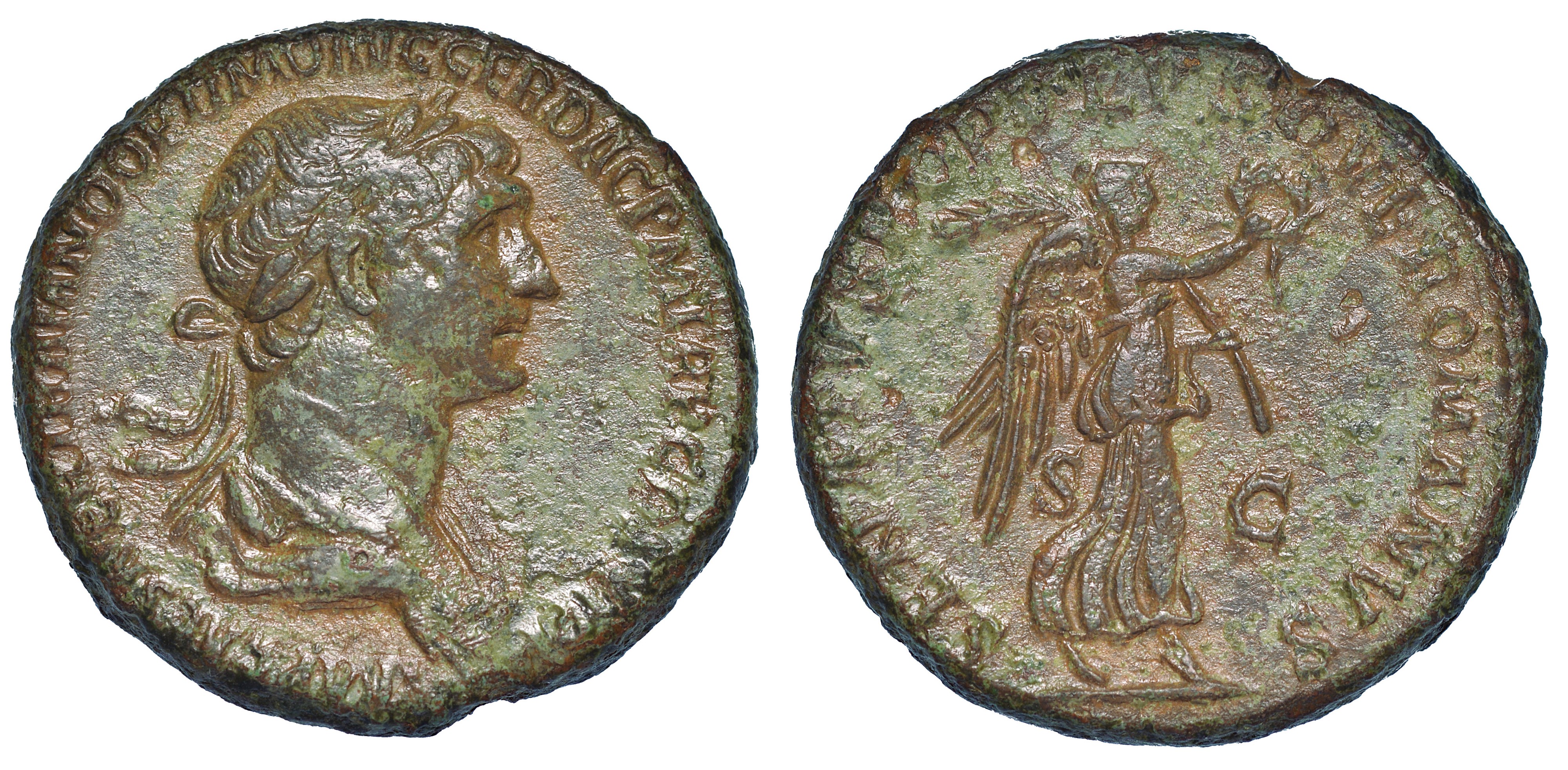 Busto laureato e drappeggiato a d. R/ Vittoria verso d. regge ghirlanda e ramo di palma. Coh. 355. RIC 675. g. 12,61. Diam. mm. 25,23. Bronzo. Patina verde chiaro-marrone. BB/q.SPL