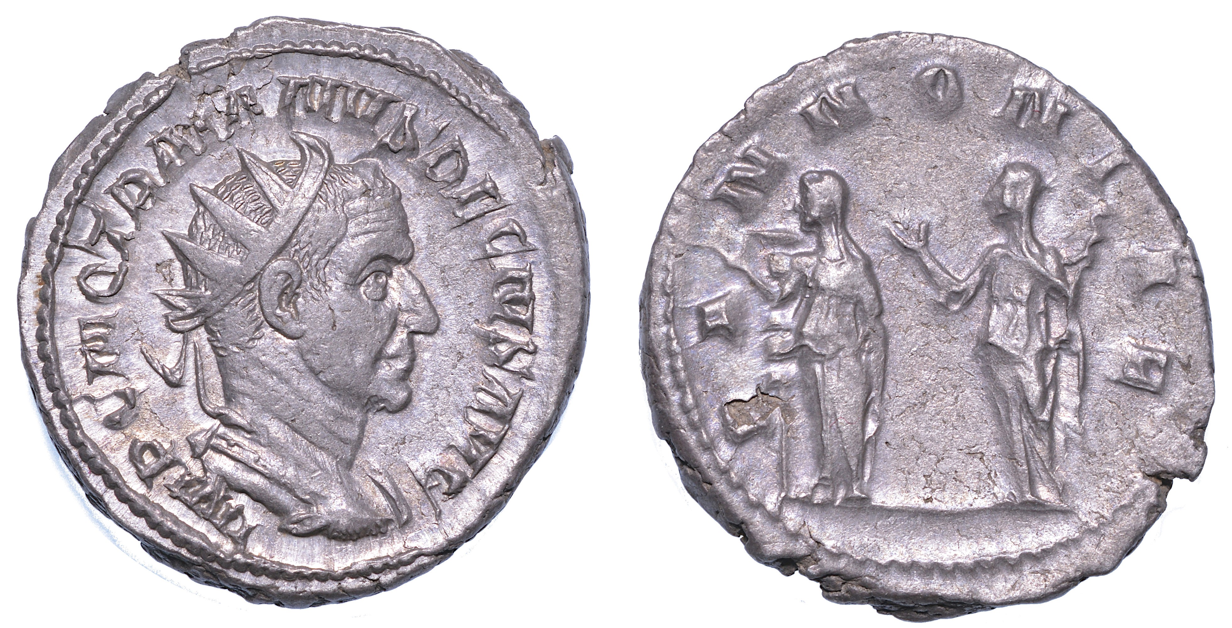 Busto radiato a d. R/ Le due Pannonie stanti reggono uno stendardo. Coh. 86. RIC 21b. g. 4,75. Diam. mm. 22,19. Mist. q.SPL