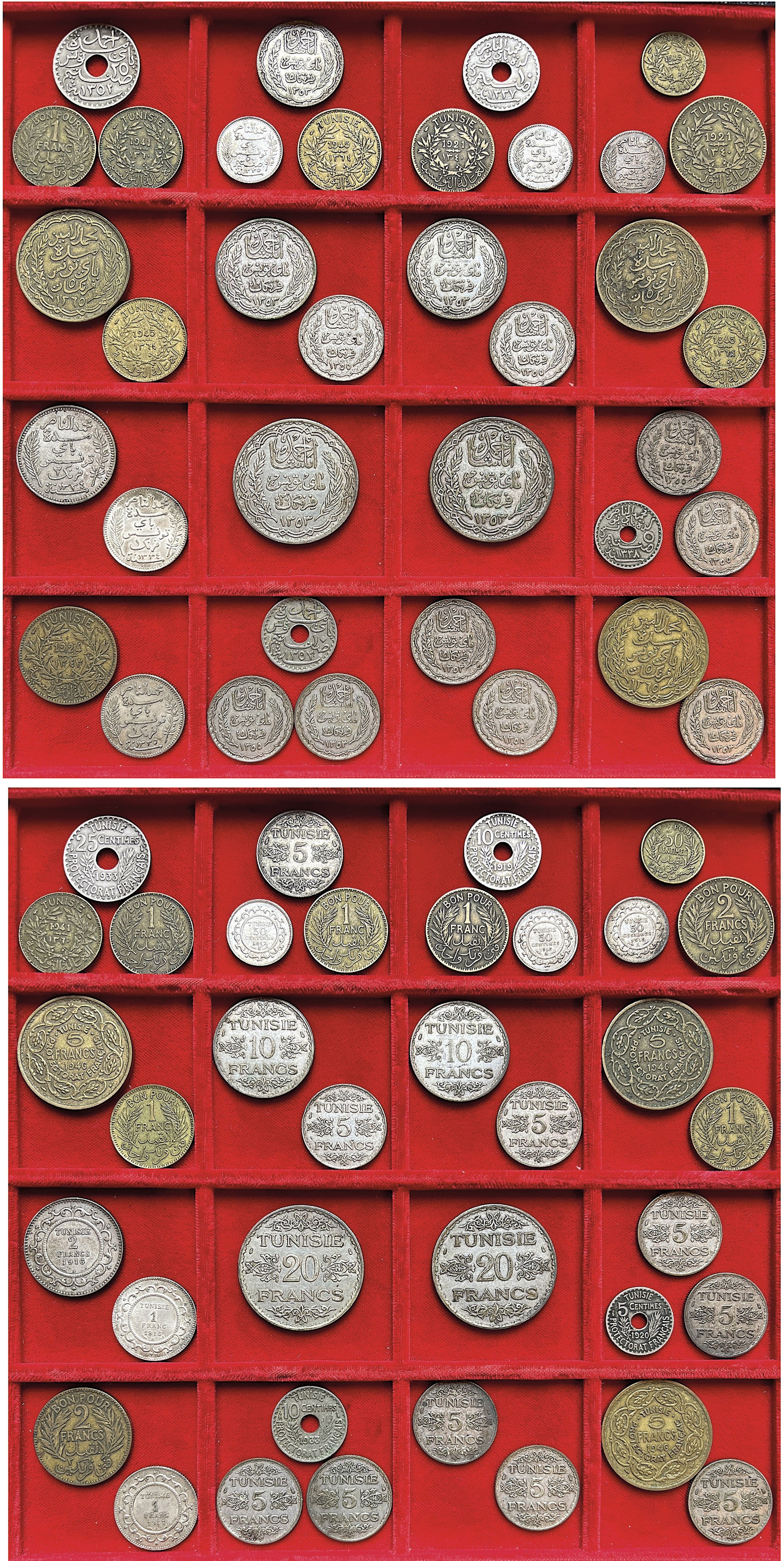 Monetazione tunisina mista dal 20 Franchi al 5 Centesimi prevalentemente del XX secolo. Argento e altri metalli. Conservazioni varie. Interessante lotto da visionare.