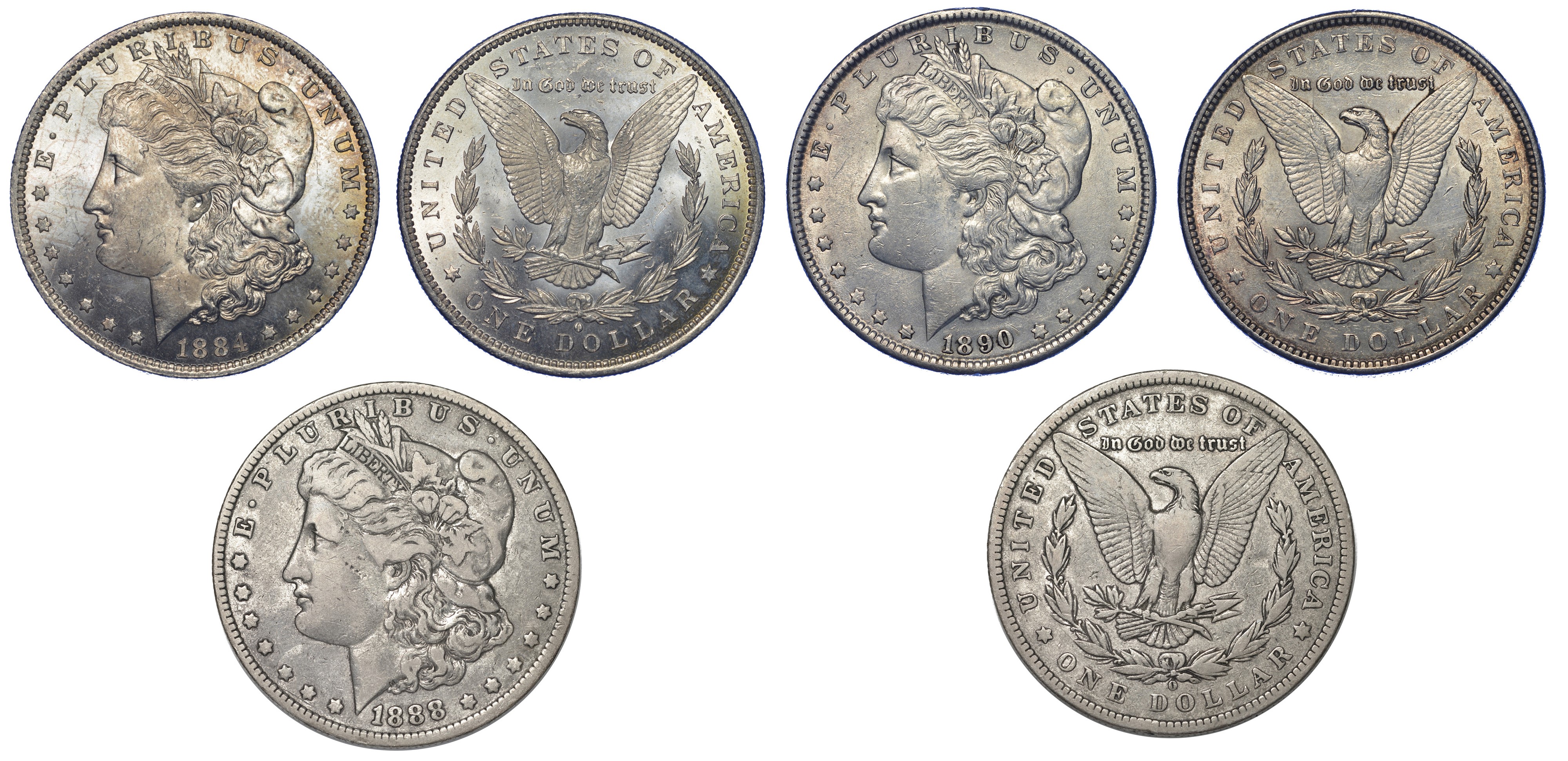 Esemplari di Morgan Dollar dei seguenti anni: 1884 (New Orleans, SPL/FDC) - 1888 (New Orleans, MB) - 1890 (Philadelphia, BB/SPL). KM# 110. Argento.